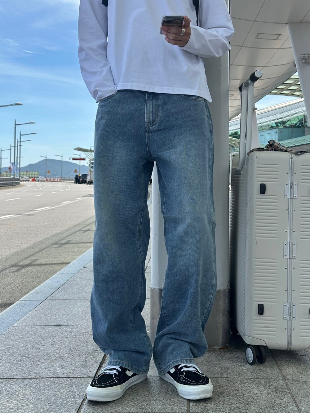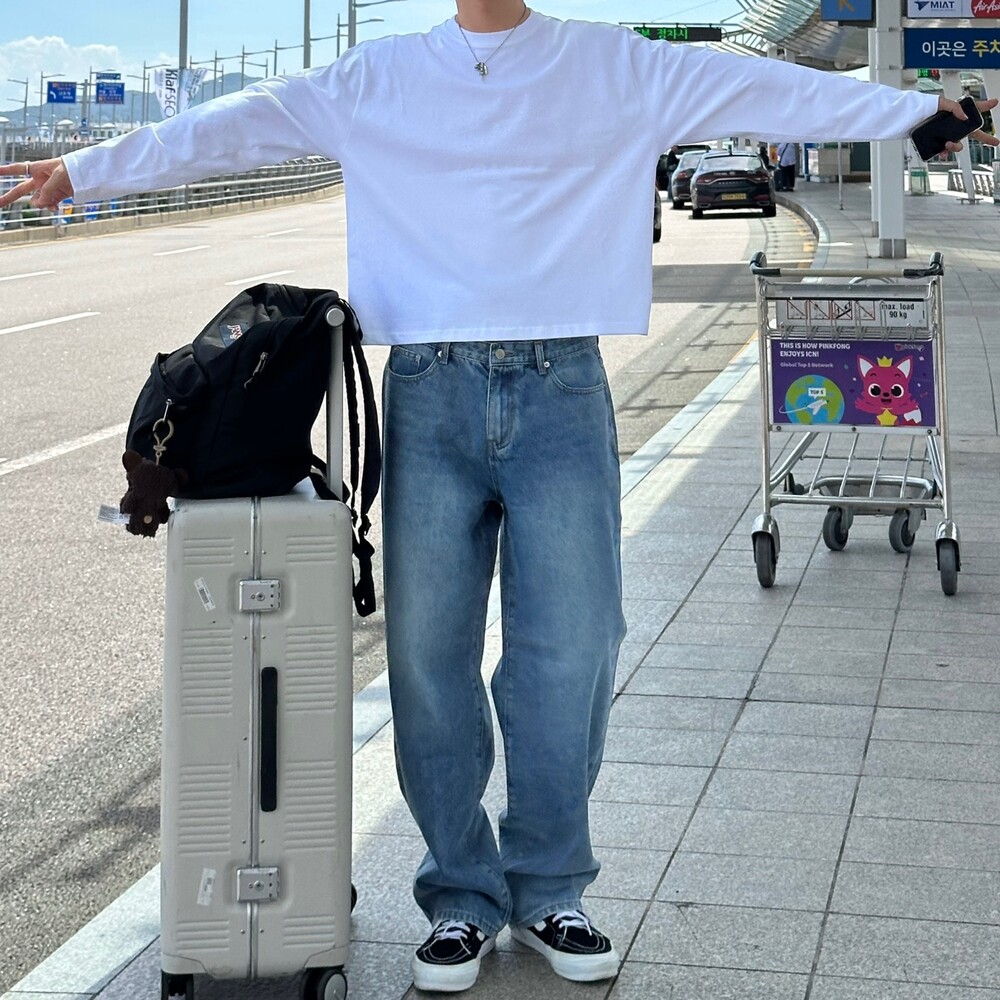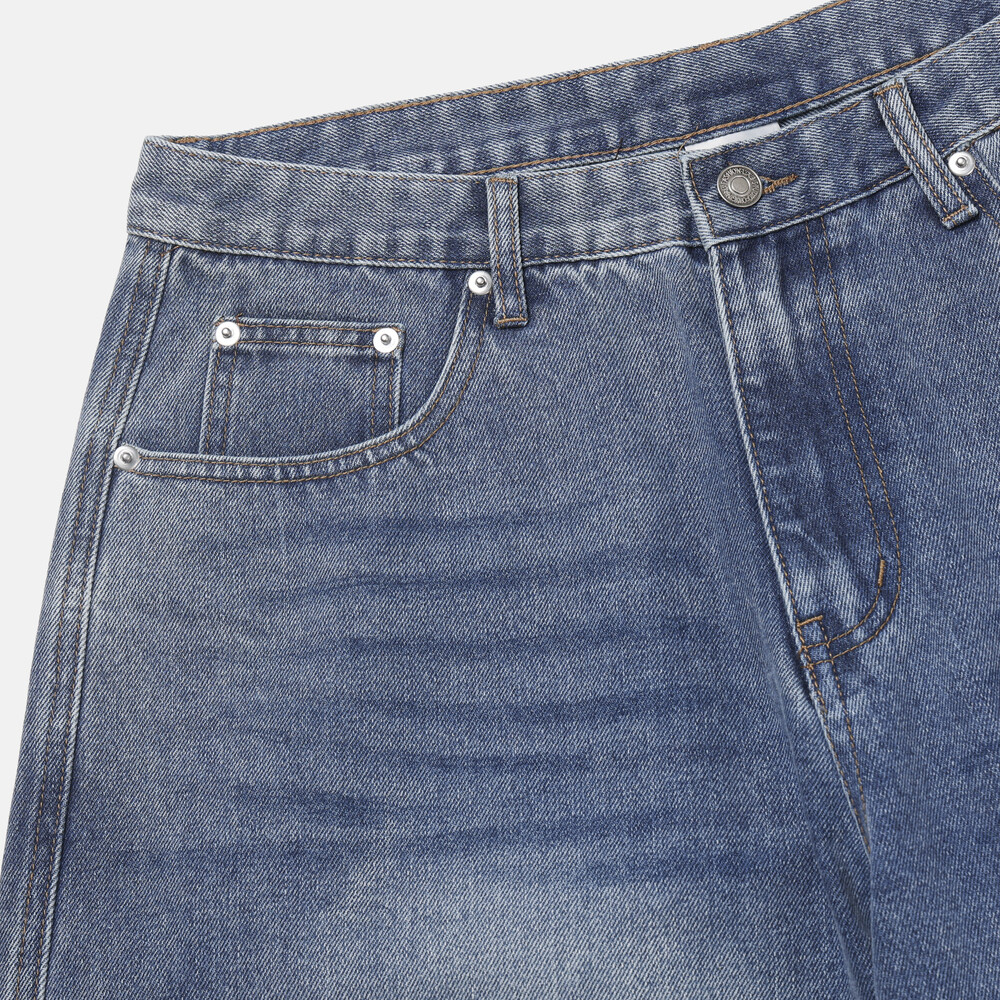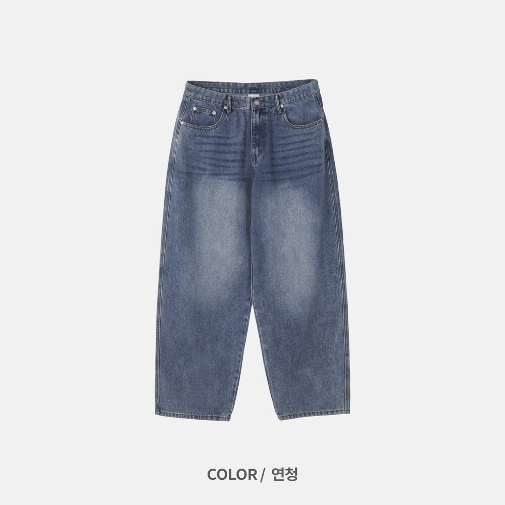 은은한 연청 워싱감에 일자 와이드 핏으로 여유로운 느낌으로 착용하기 좋습니다