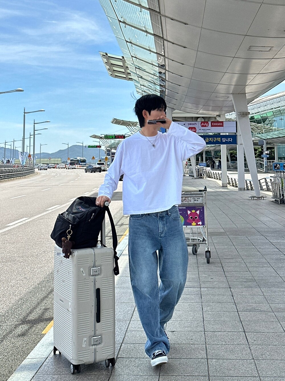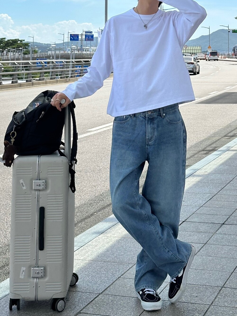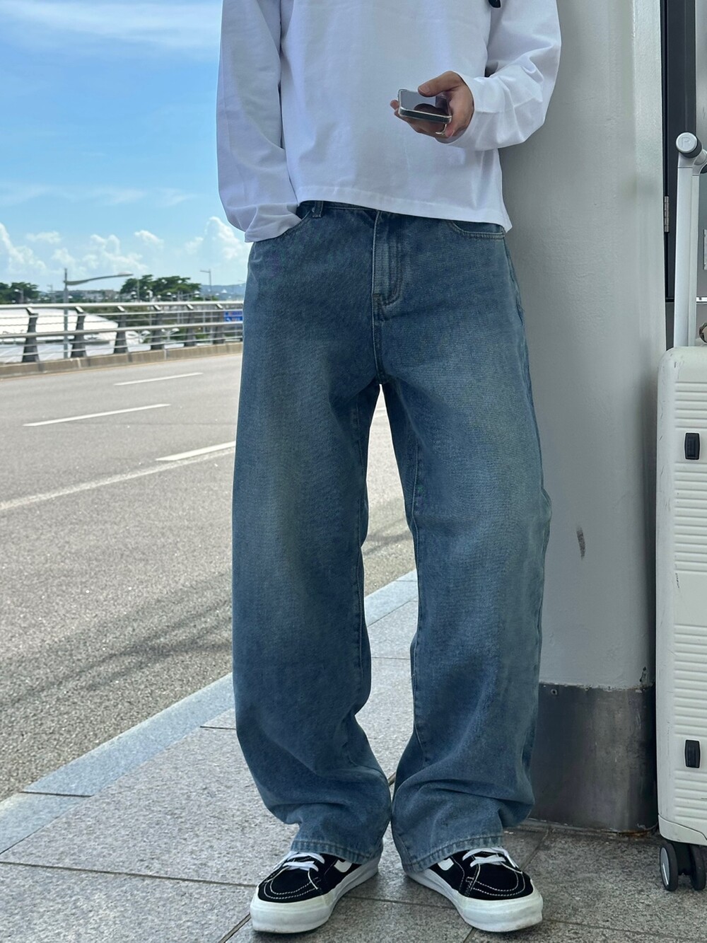 은은한 연청 워싱감에 일자 와이드 핏으로 여유로운 느낌으로 착용하기 좋습니다