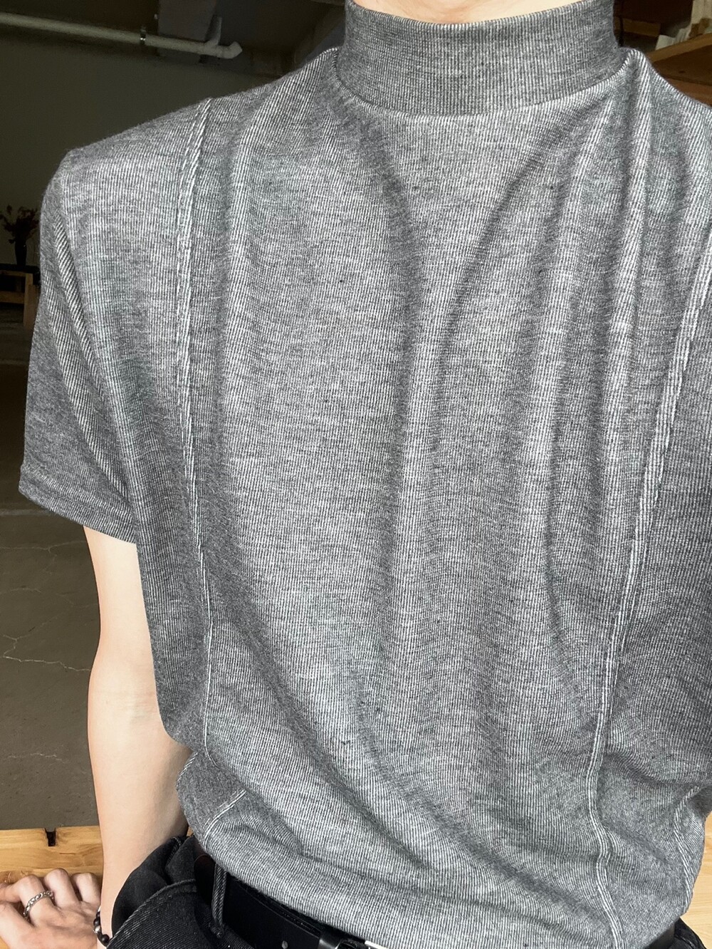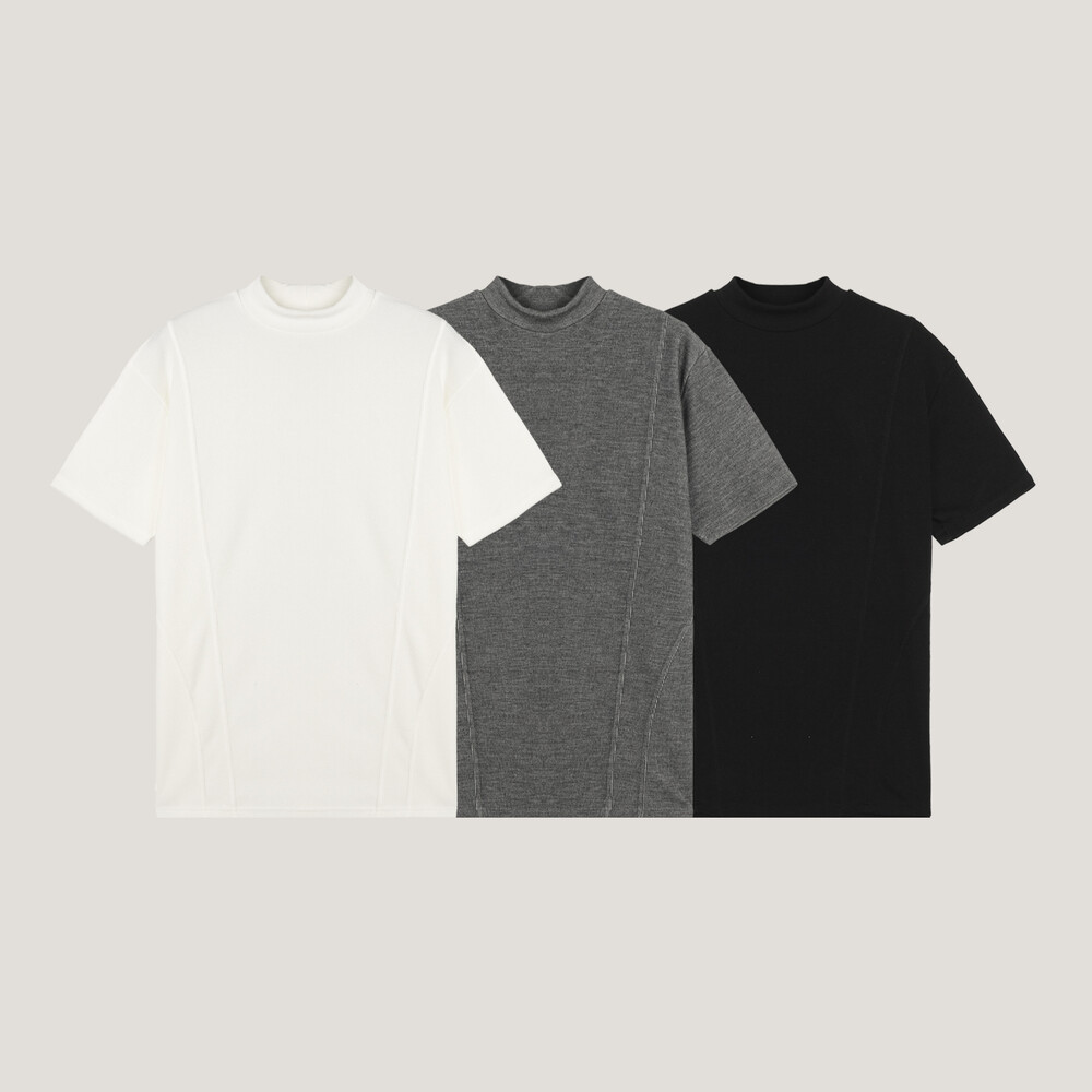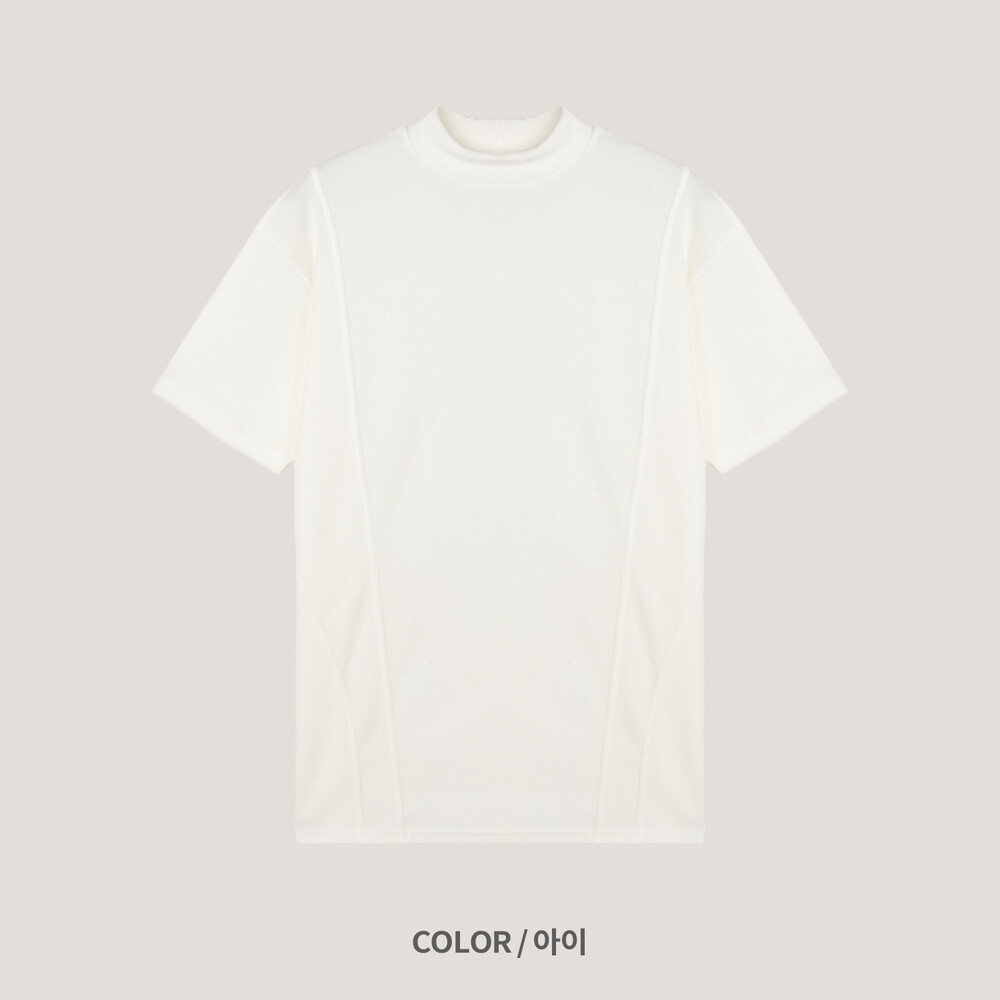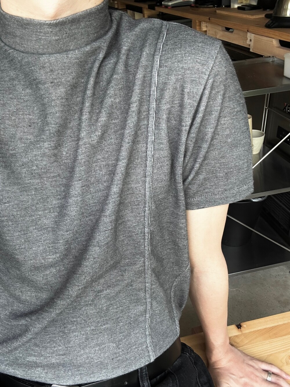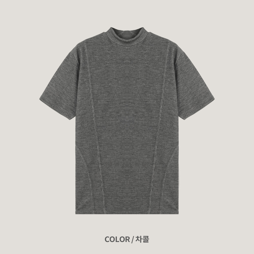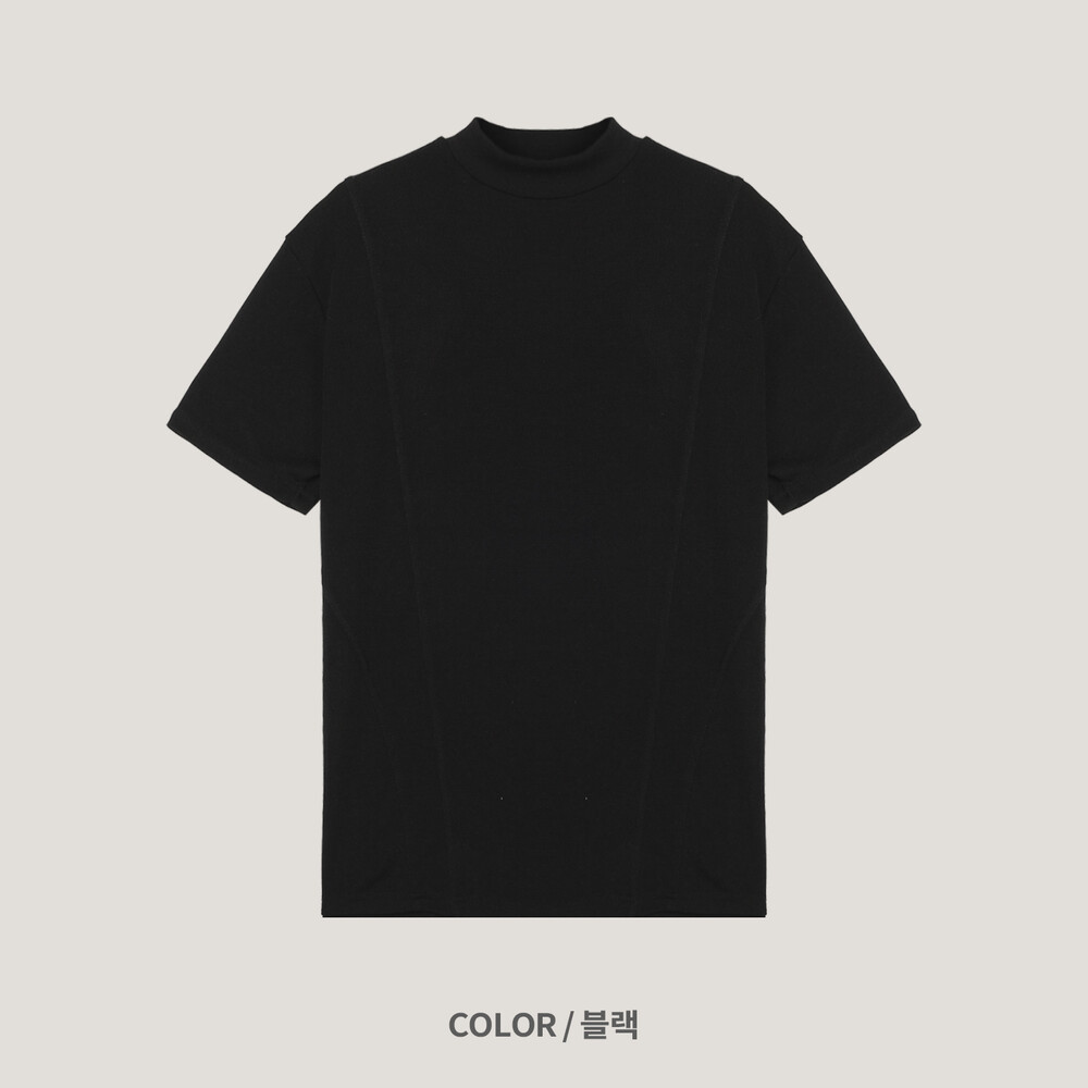 차분해보이는 무드를 주는 반목폴라 디테일에 밋밋하지 않게 앞판 절개포인트가 인상적인 티셔츠입니다 :)