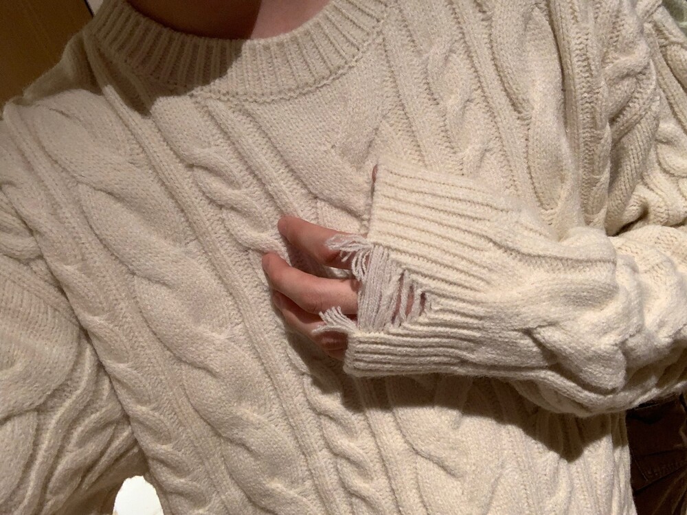 부드럽고 포근한 무드의 니트에 데미지 디테일을 넣어서 빈티지함과 유니크함을 섞은 니트에요