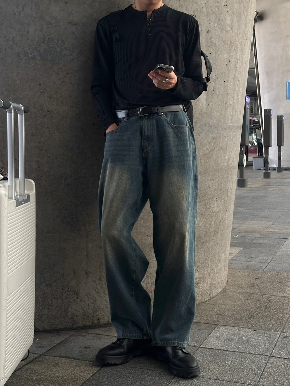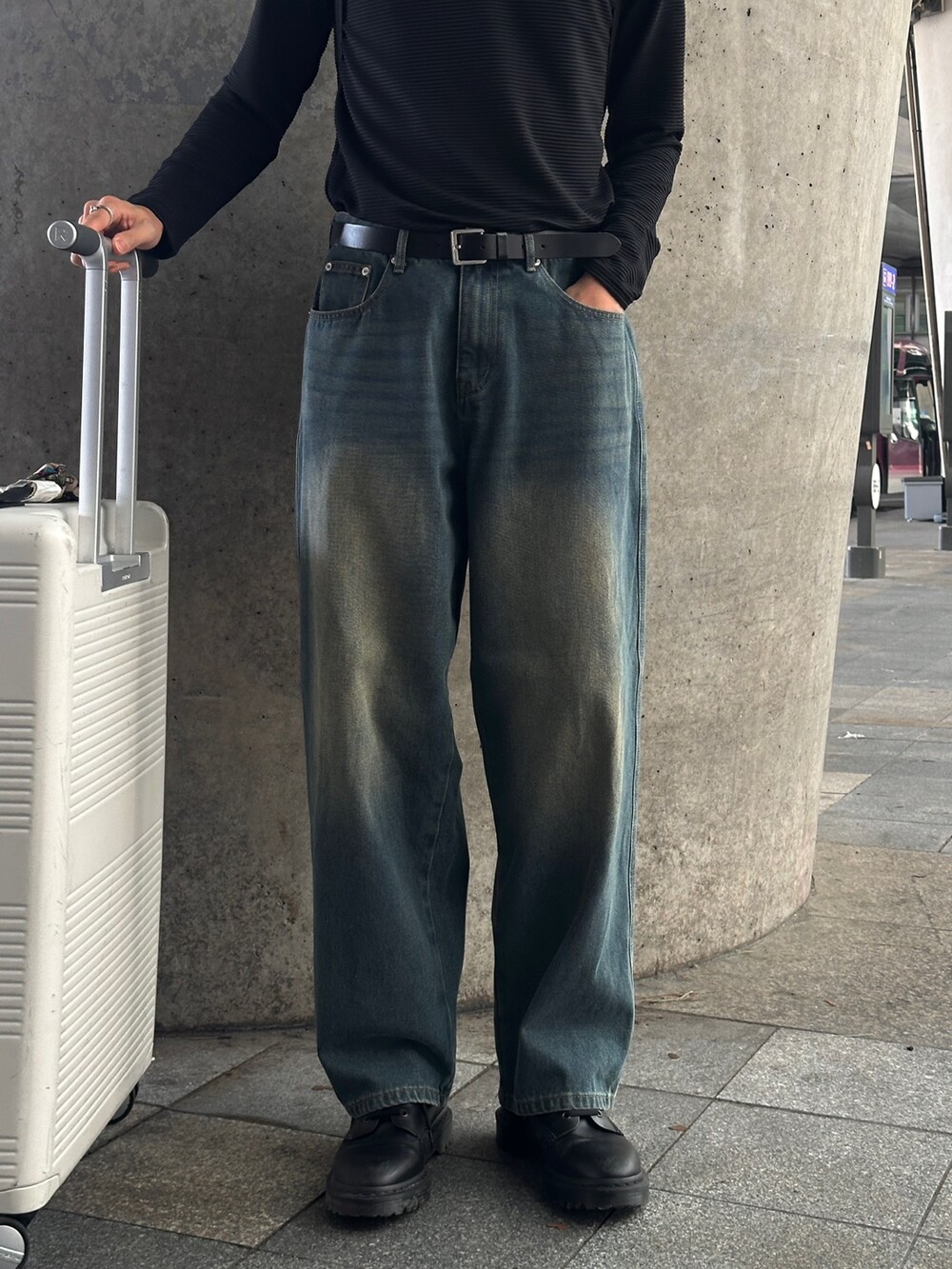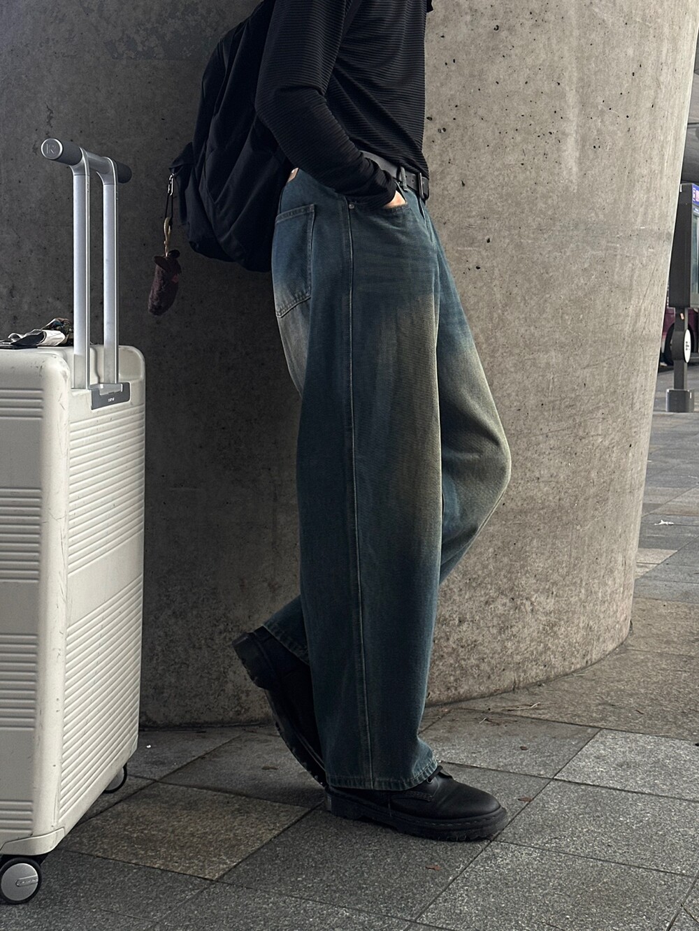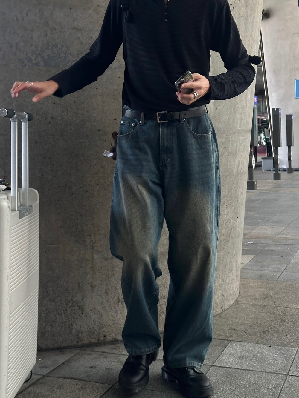 은은한 오일 진청 워싱감에 세미한 벌룬 핏으로 여유로운 느낌으로 착용하기 좋습니다