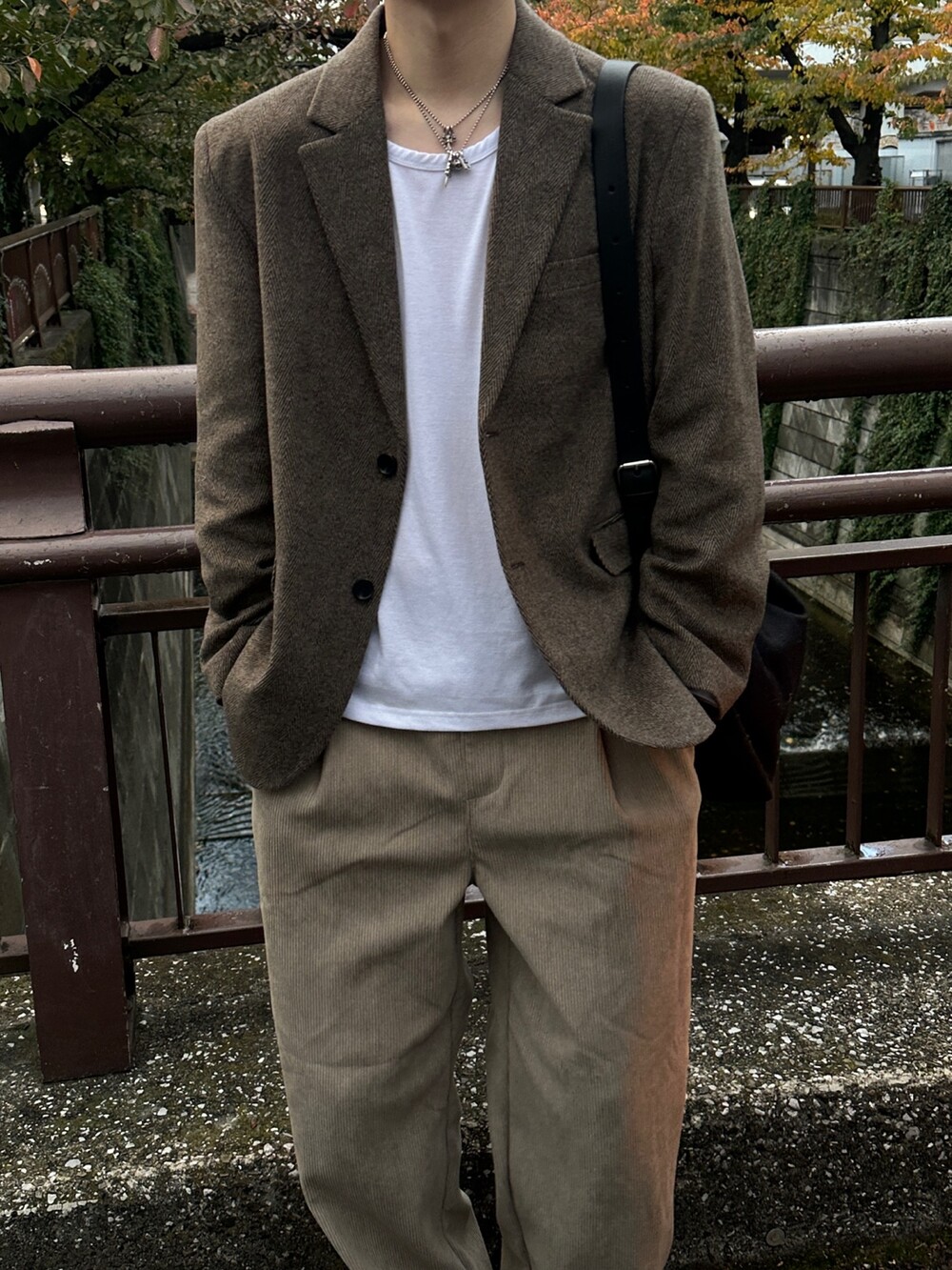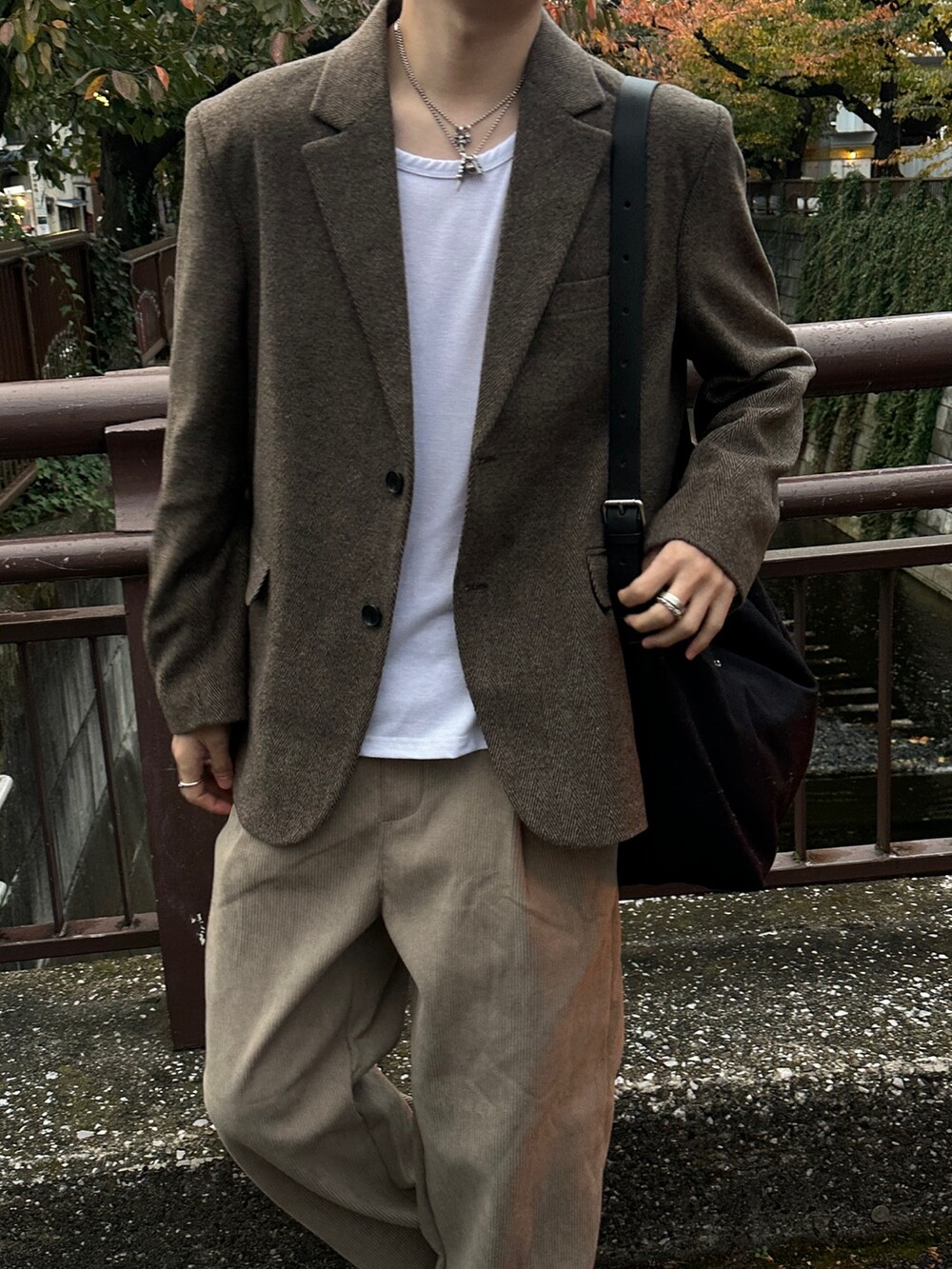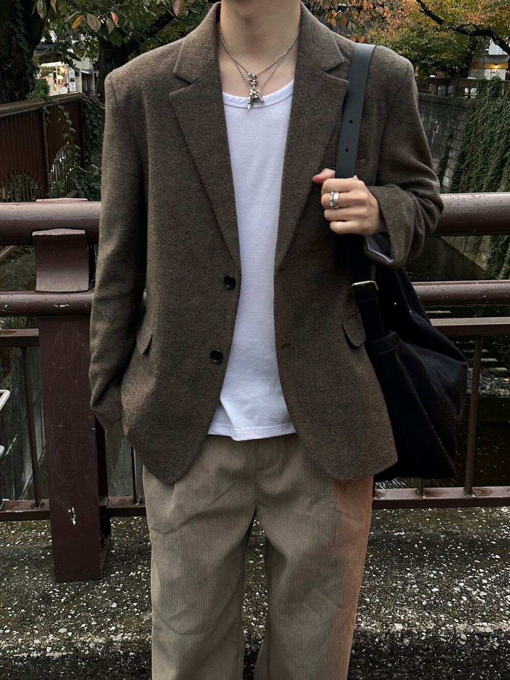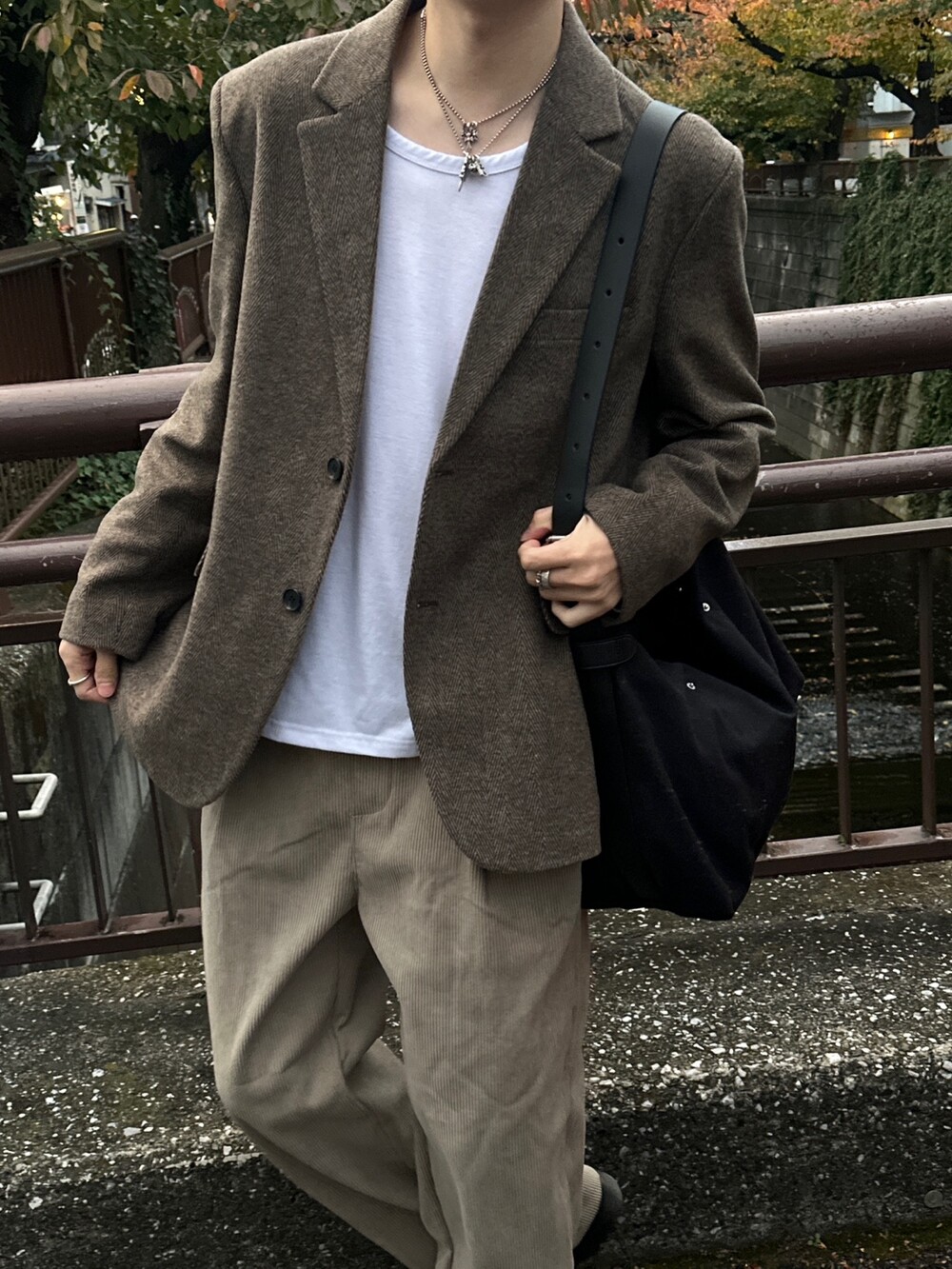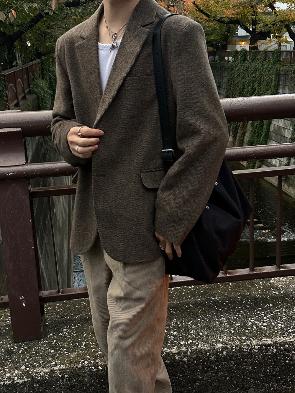 고급스러운 무드가 돋보이는 헤링본 울 블레이져입니다