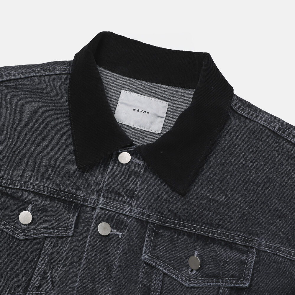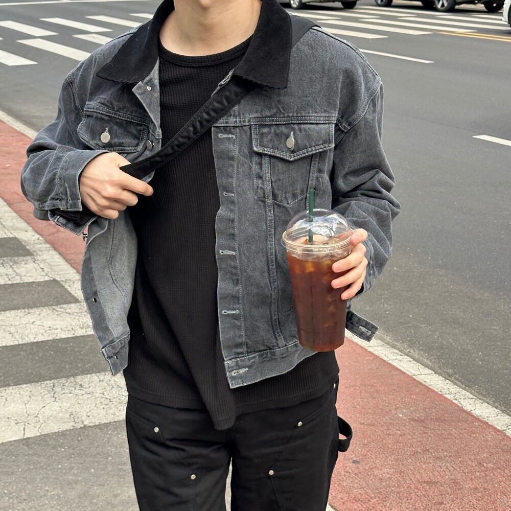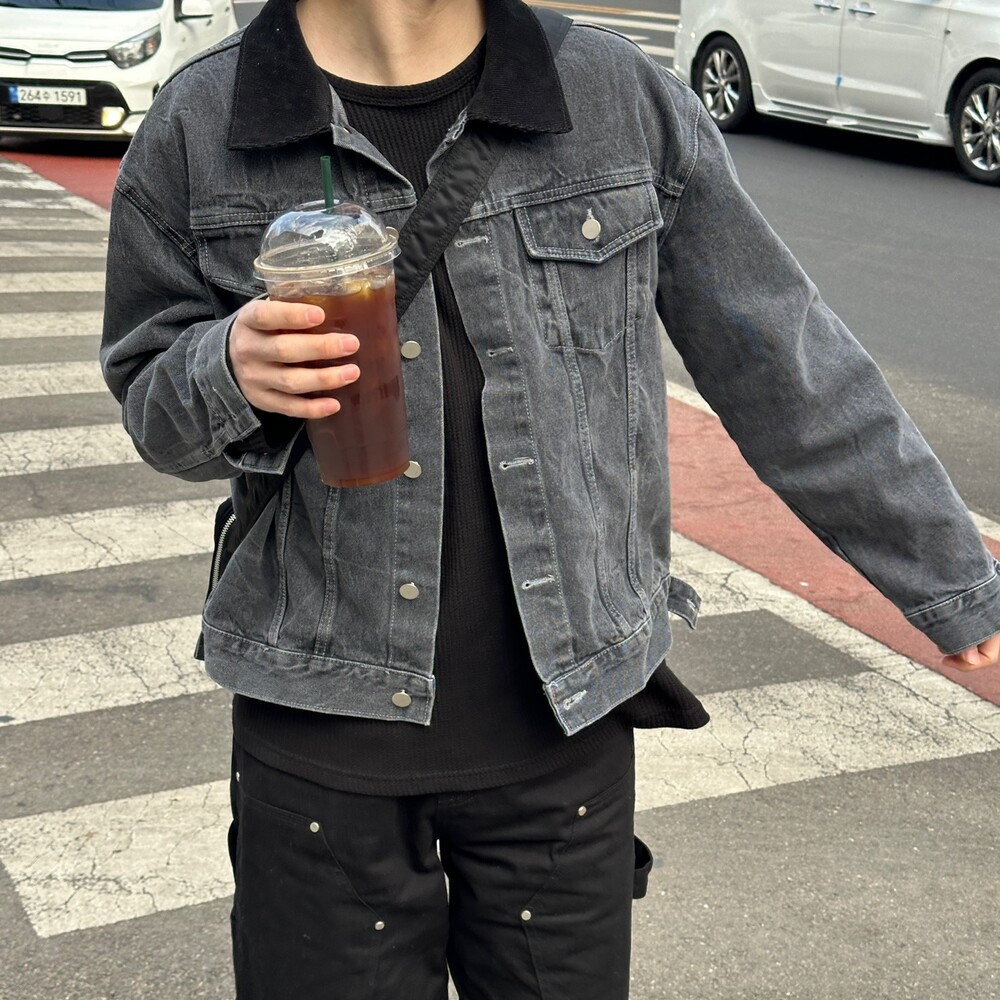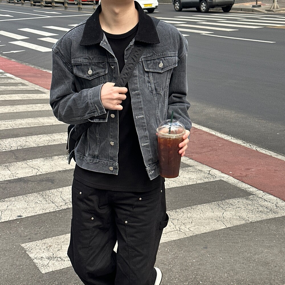 무채색 크랙 워싱에 블랙카라로 마무리한 디자인이 흔하지 않지만