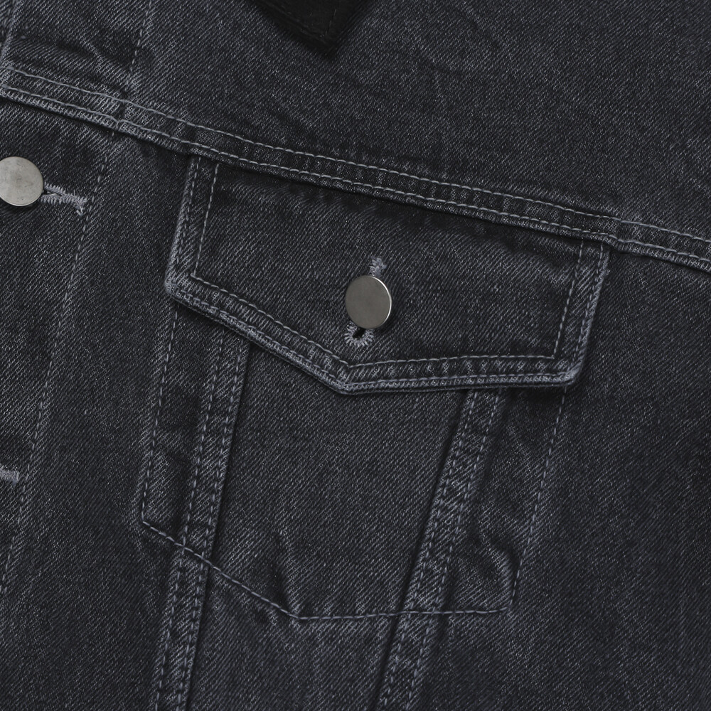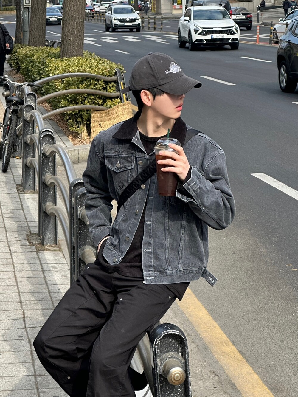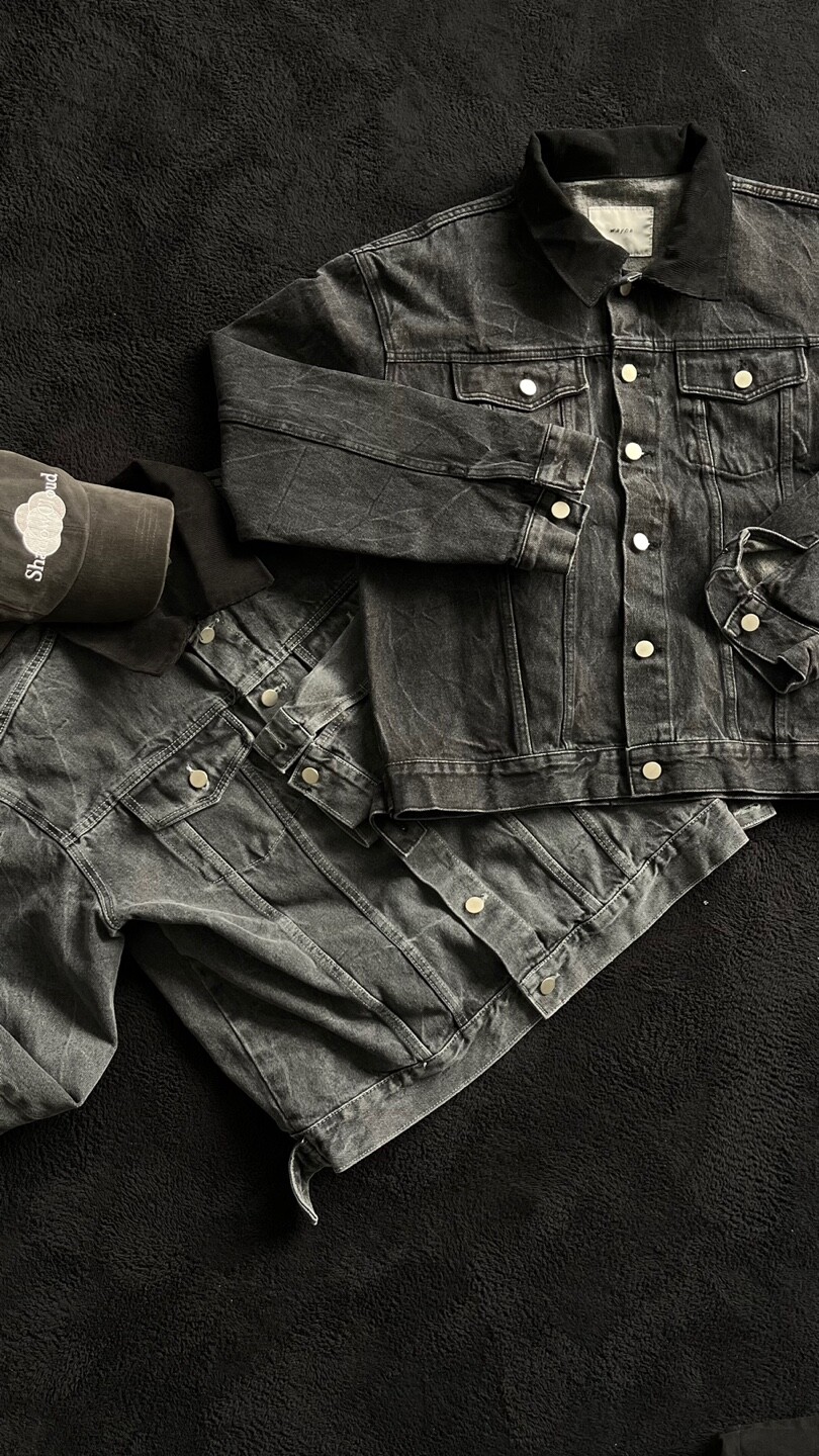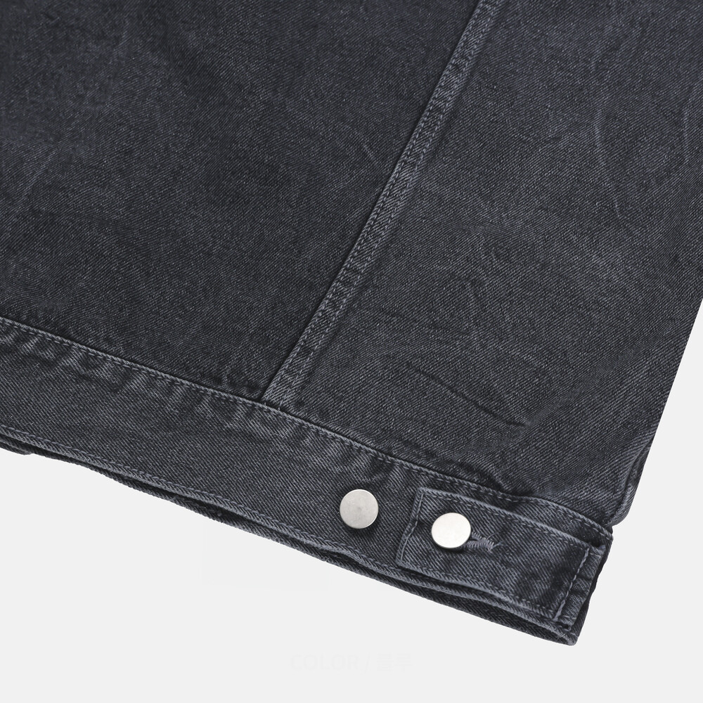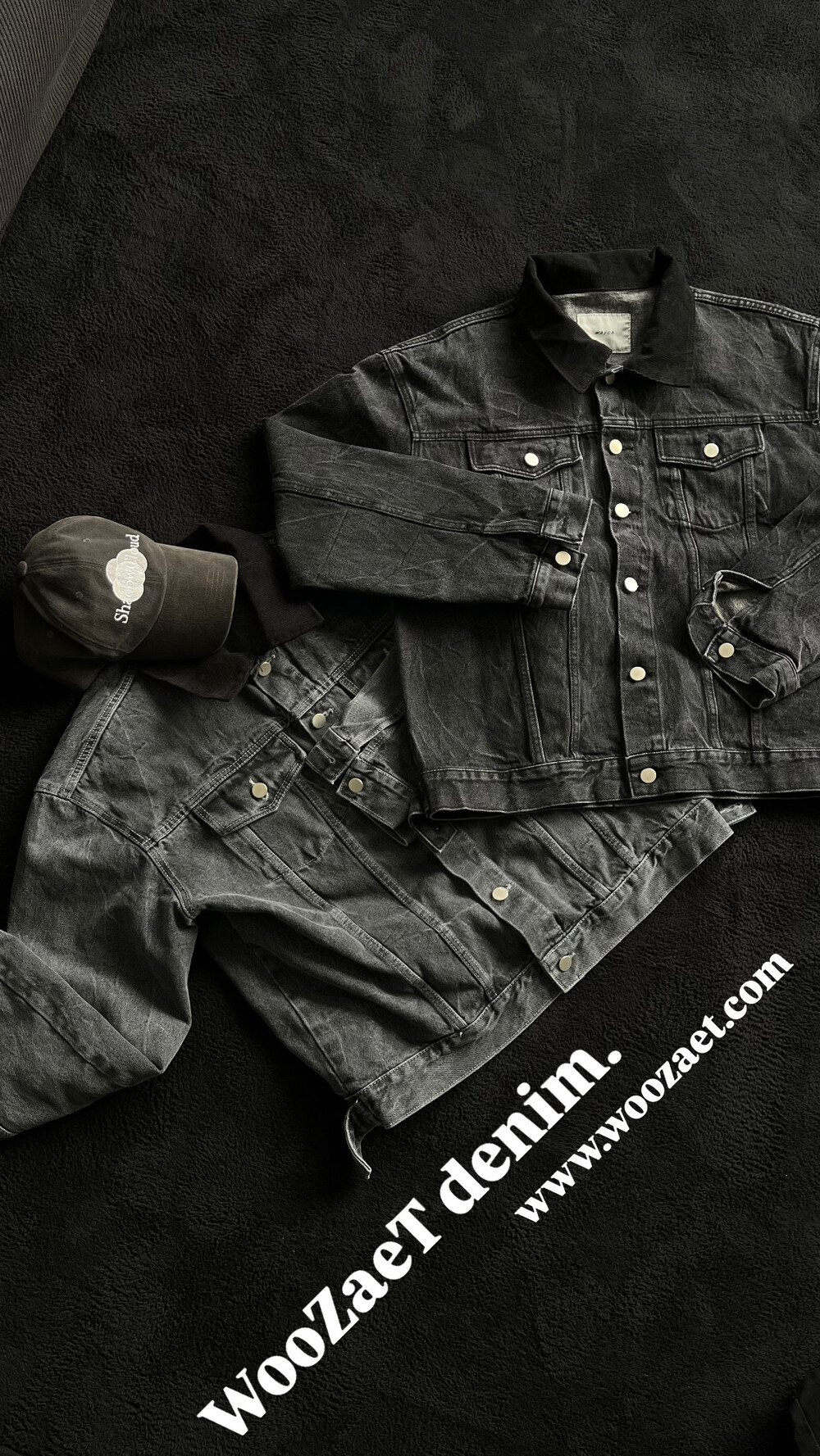 무채색 크랙 워싱에 블랙카라로 마무리한 디자인이 흔하지 않지만
