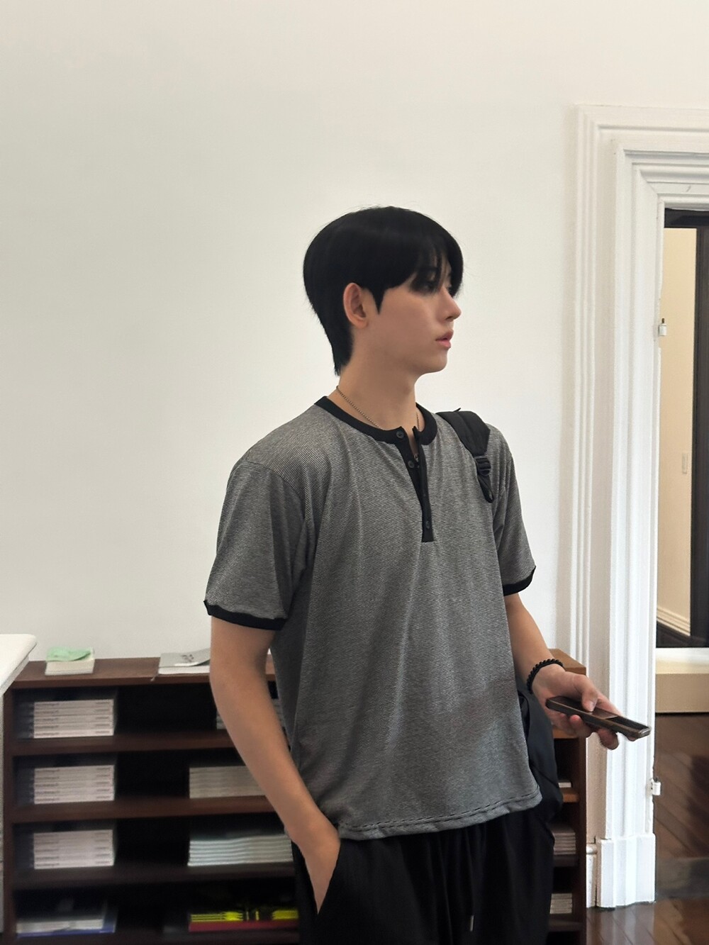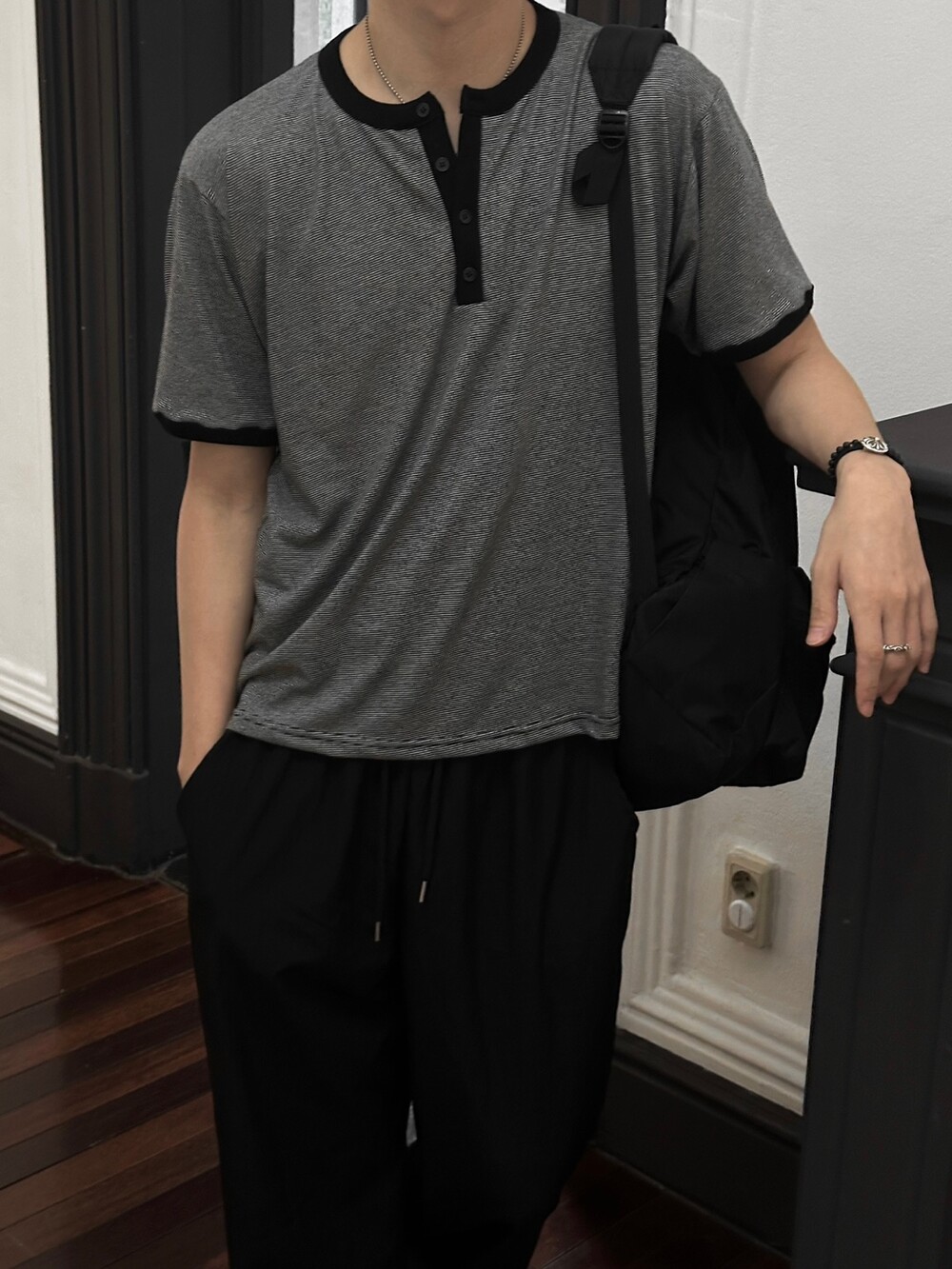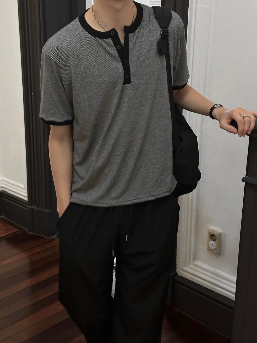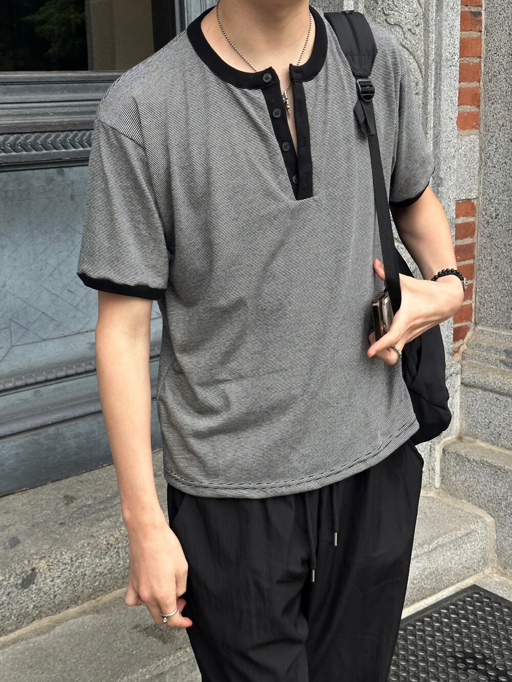 크롭 기장감으로 키에 상관없이 착용하기 좋고 헨리넥 디테일과 링거 디테일을 합쳐