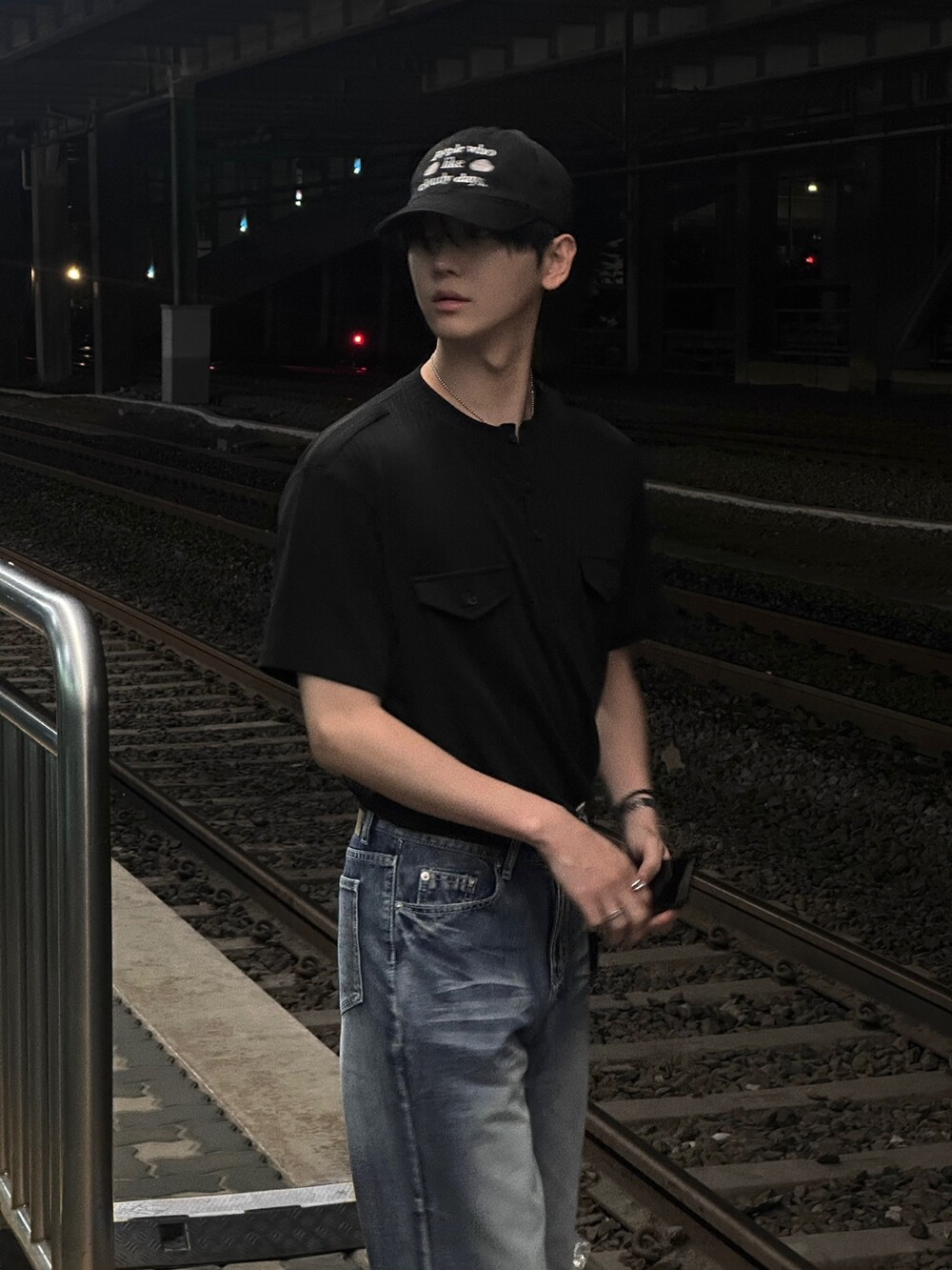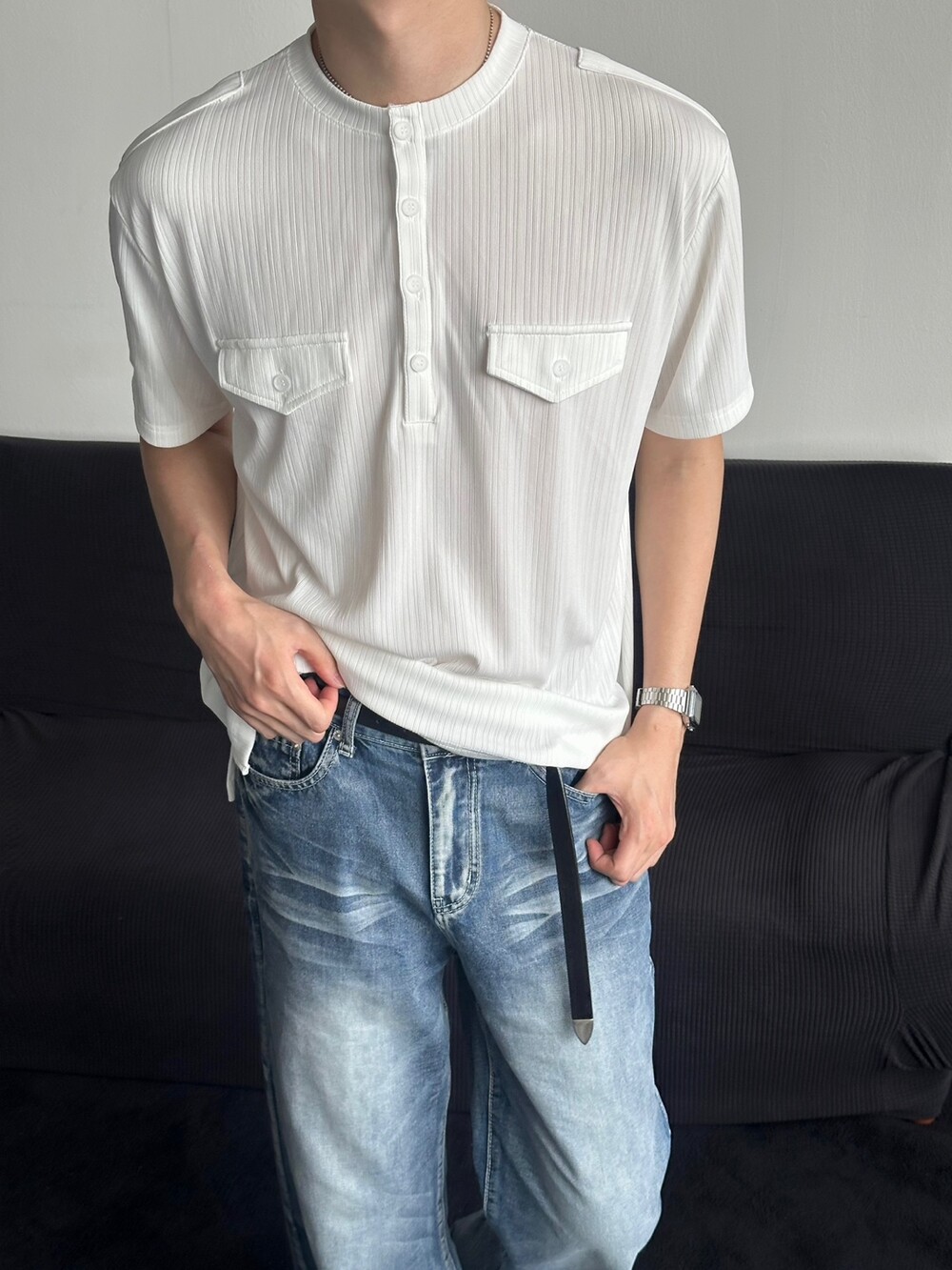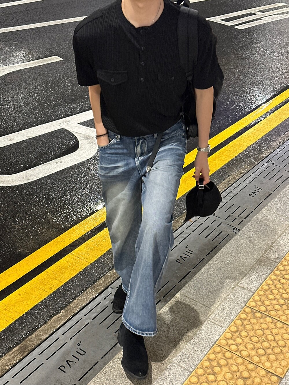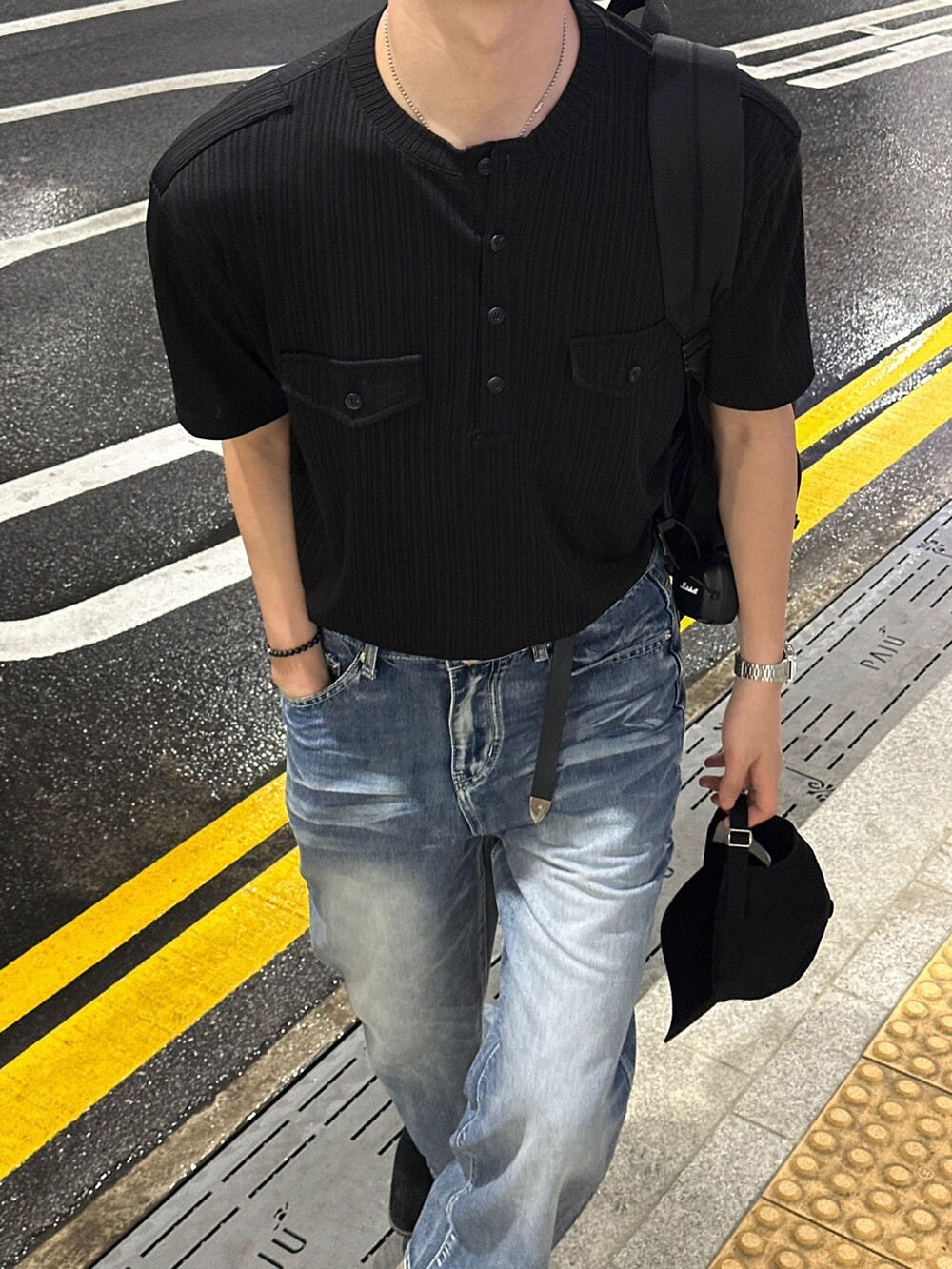 길게 내려온 5버튼 헨리넥 티셔츠입니다