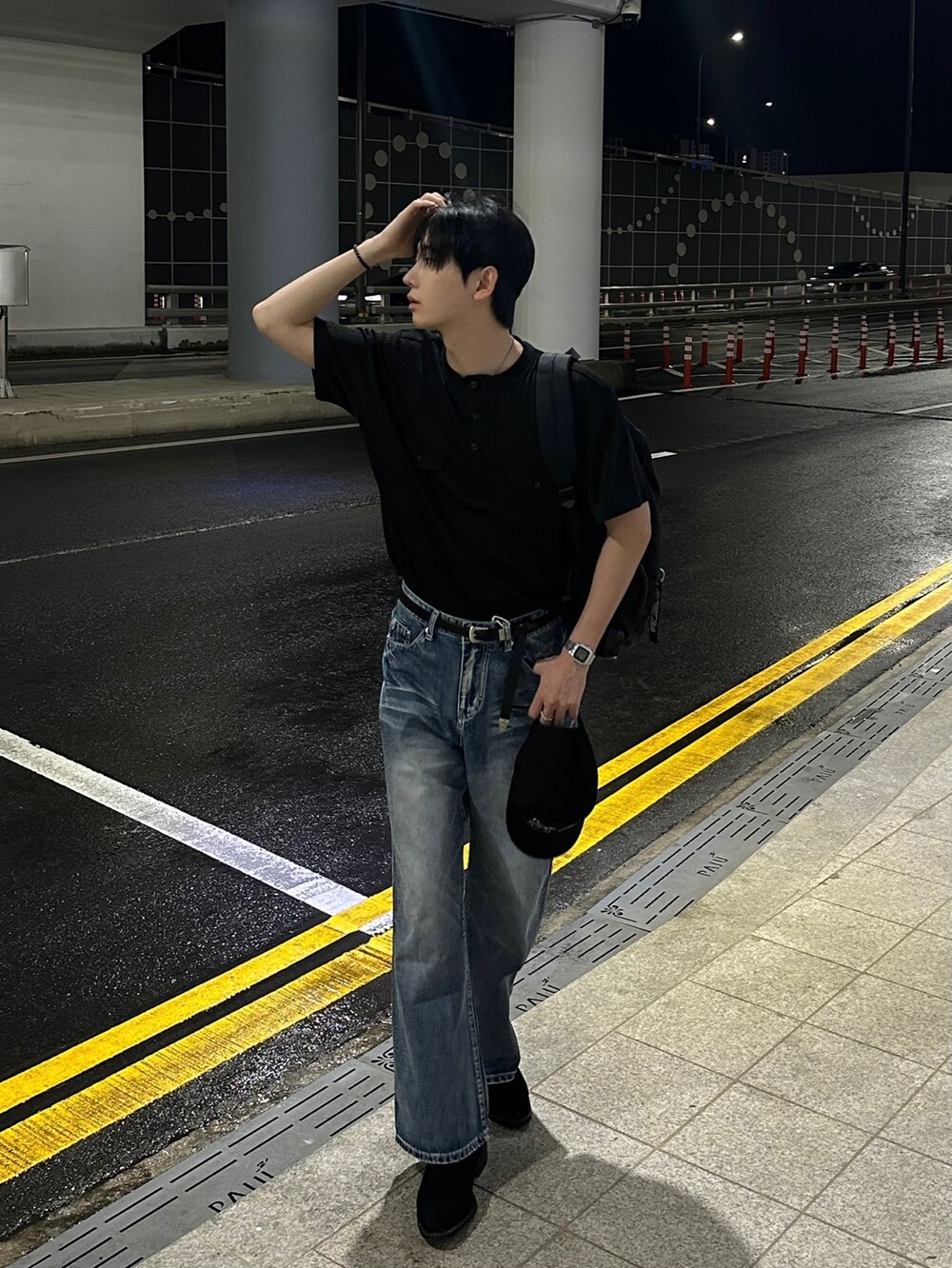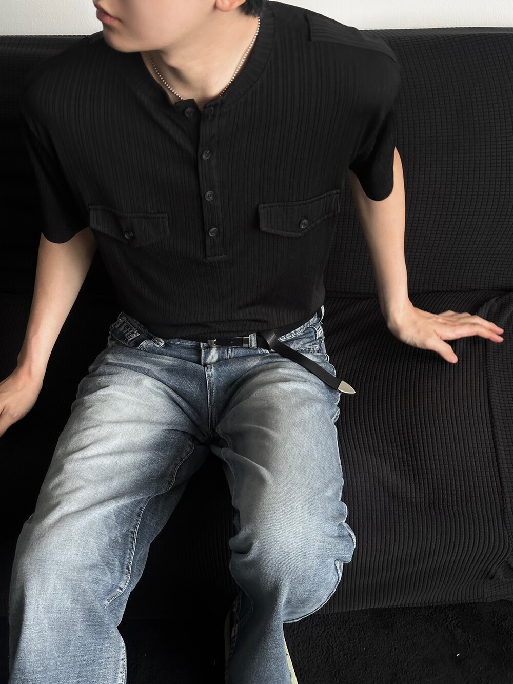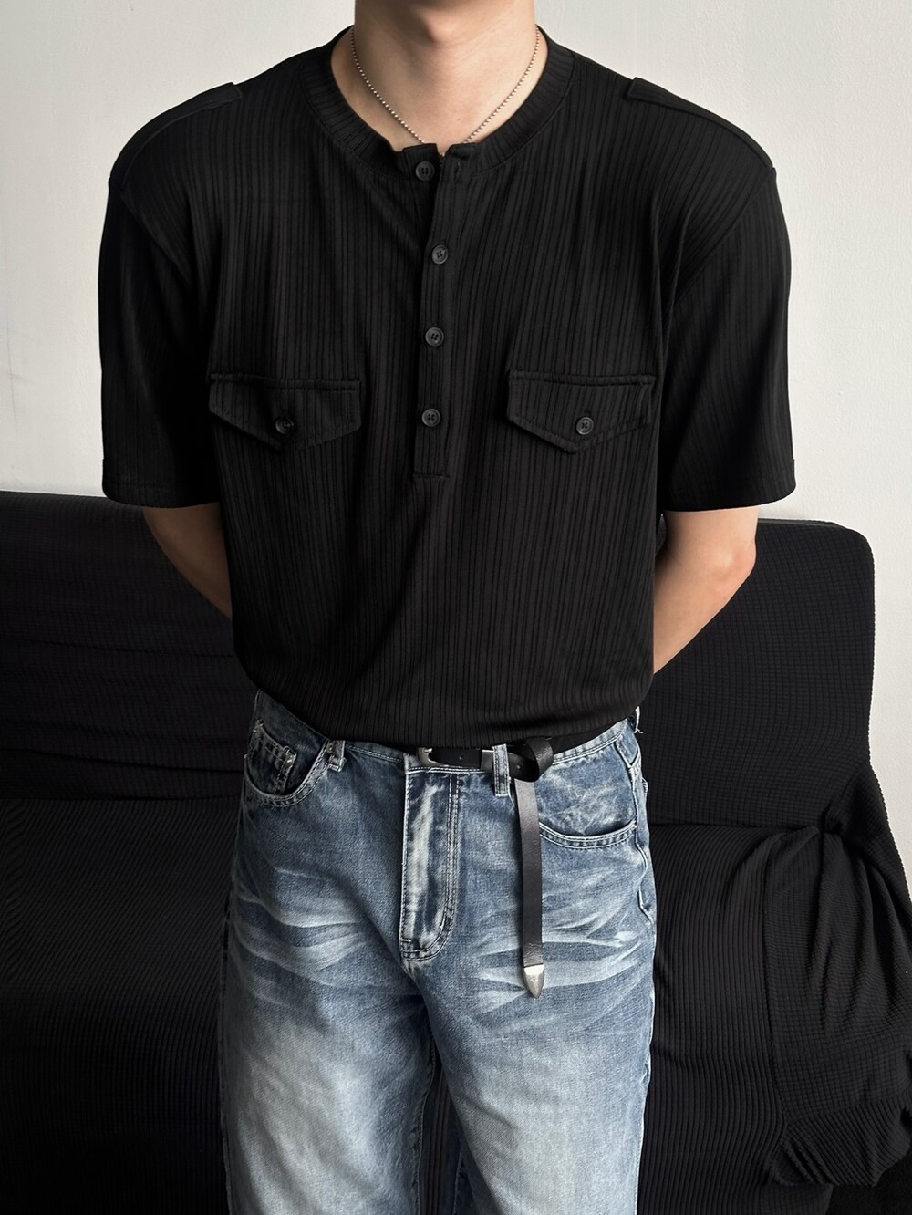 길게 내려온 5버튼 헨리넥 티셔츠입니다