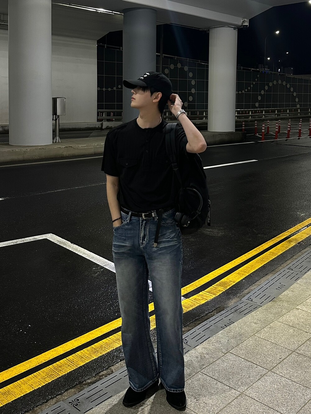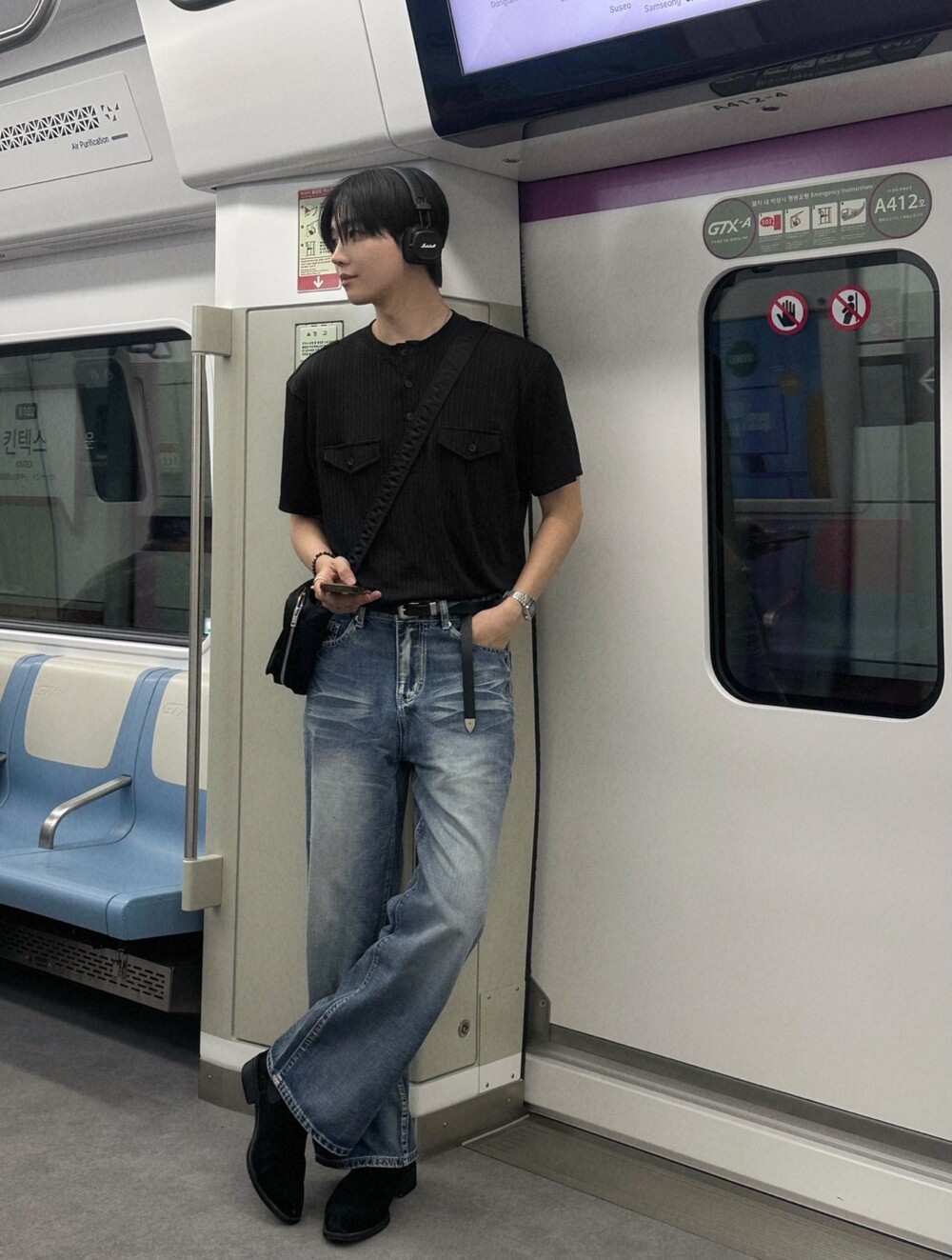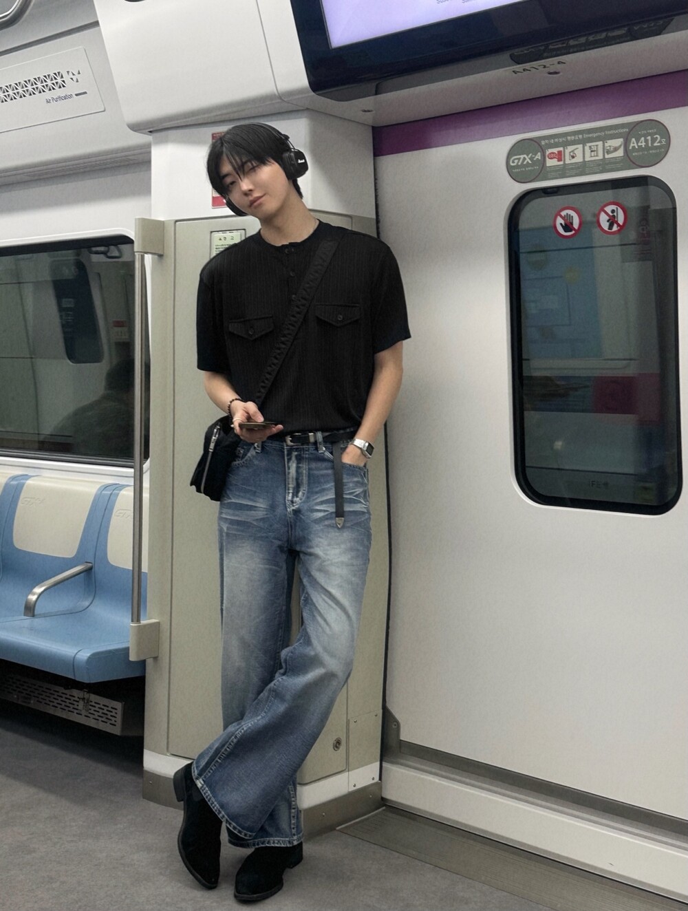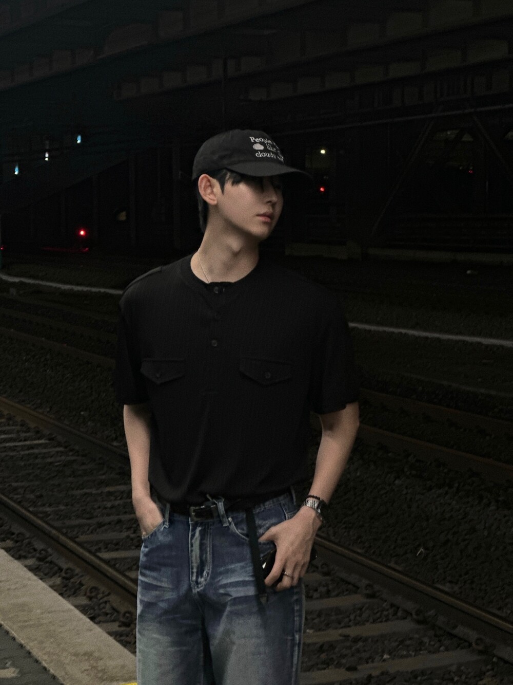 길게 내려온 5버튼 헨리넥 티셔츠입니다