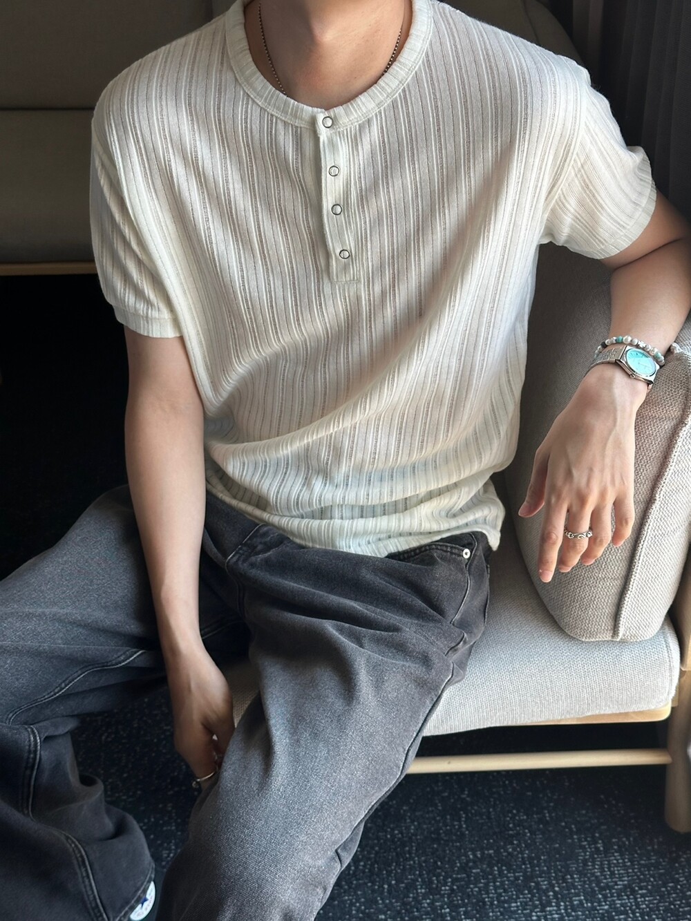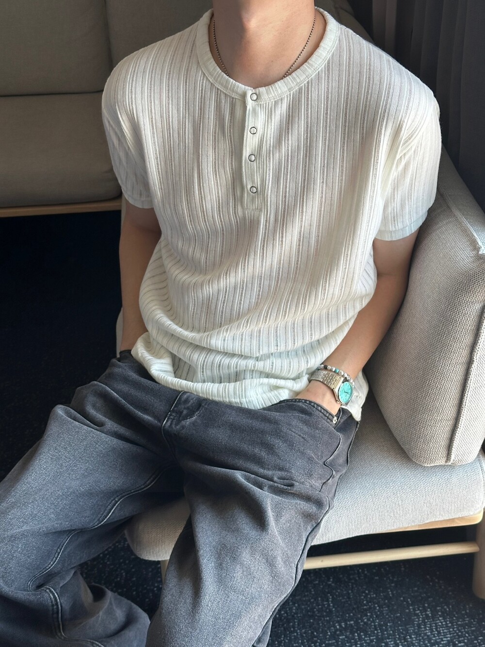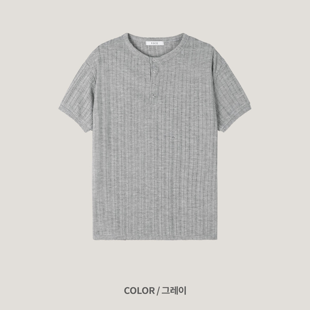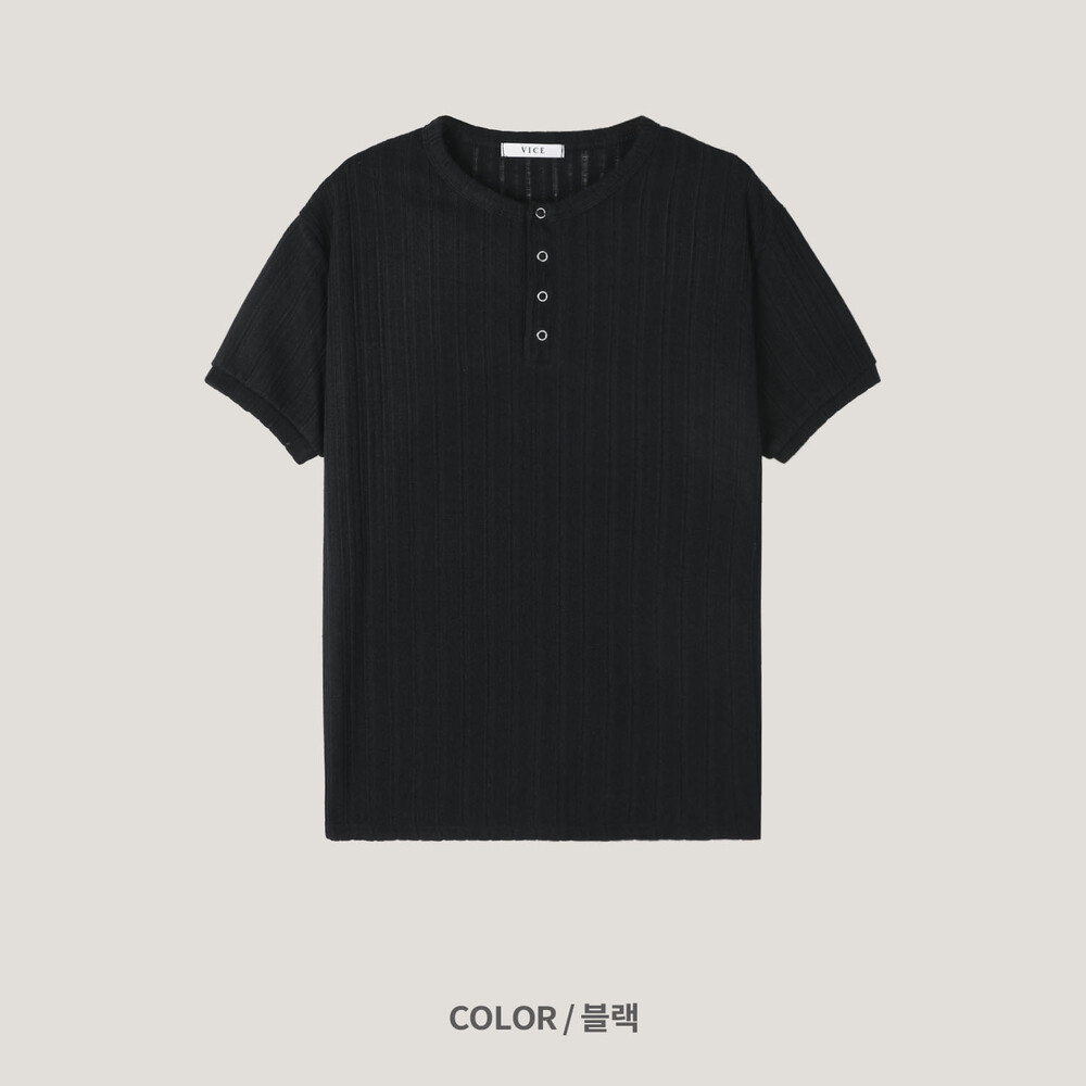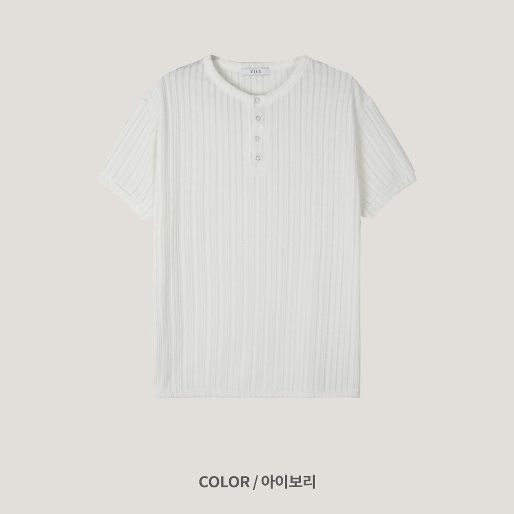 4버튼 실버 헨리넥 디테일에 사이사이 스트라이프 디테일에 바람이 송송 통풍성 좋은 티셔츠입니다 :)