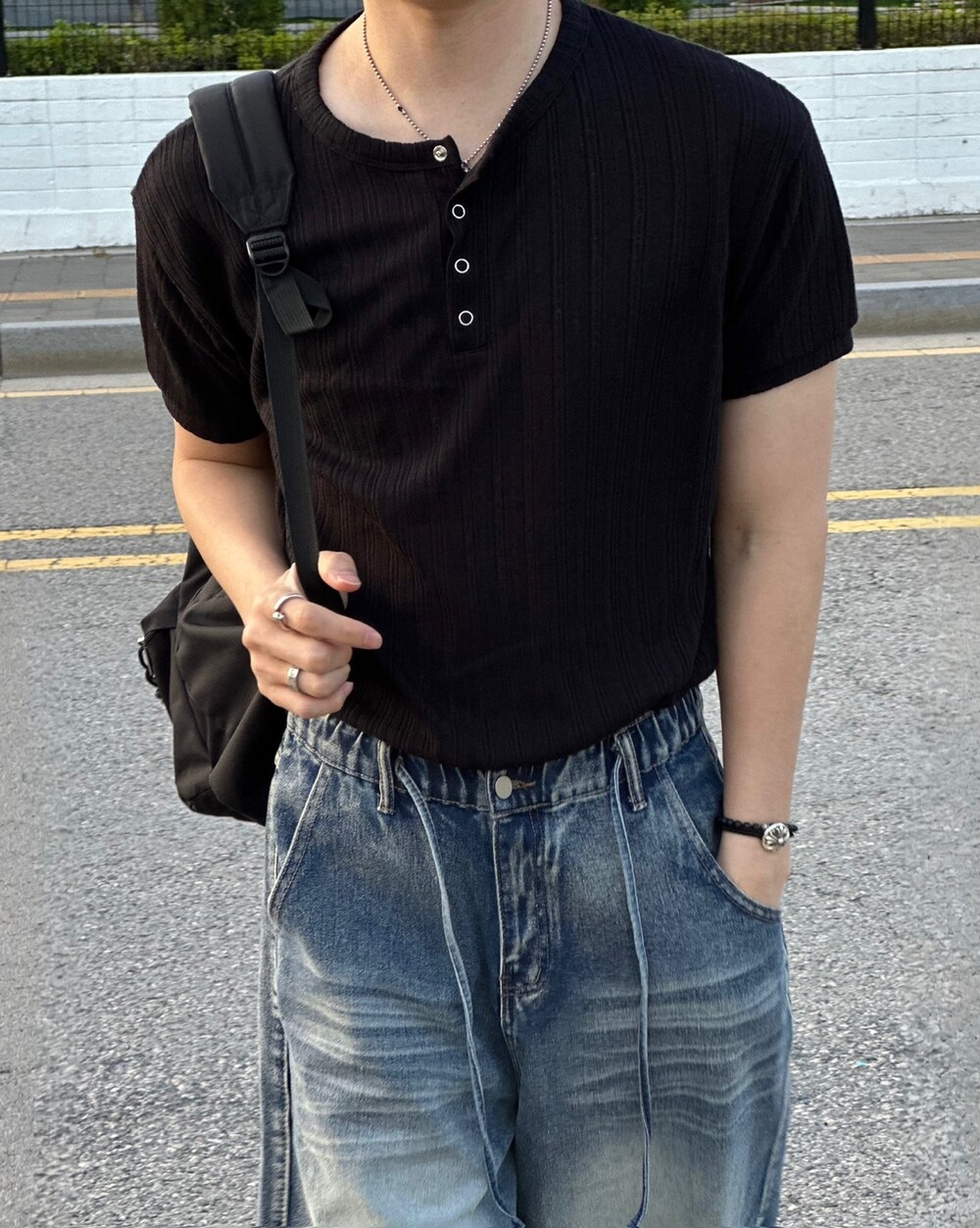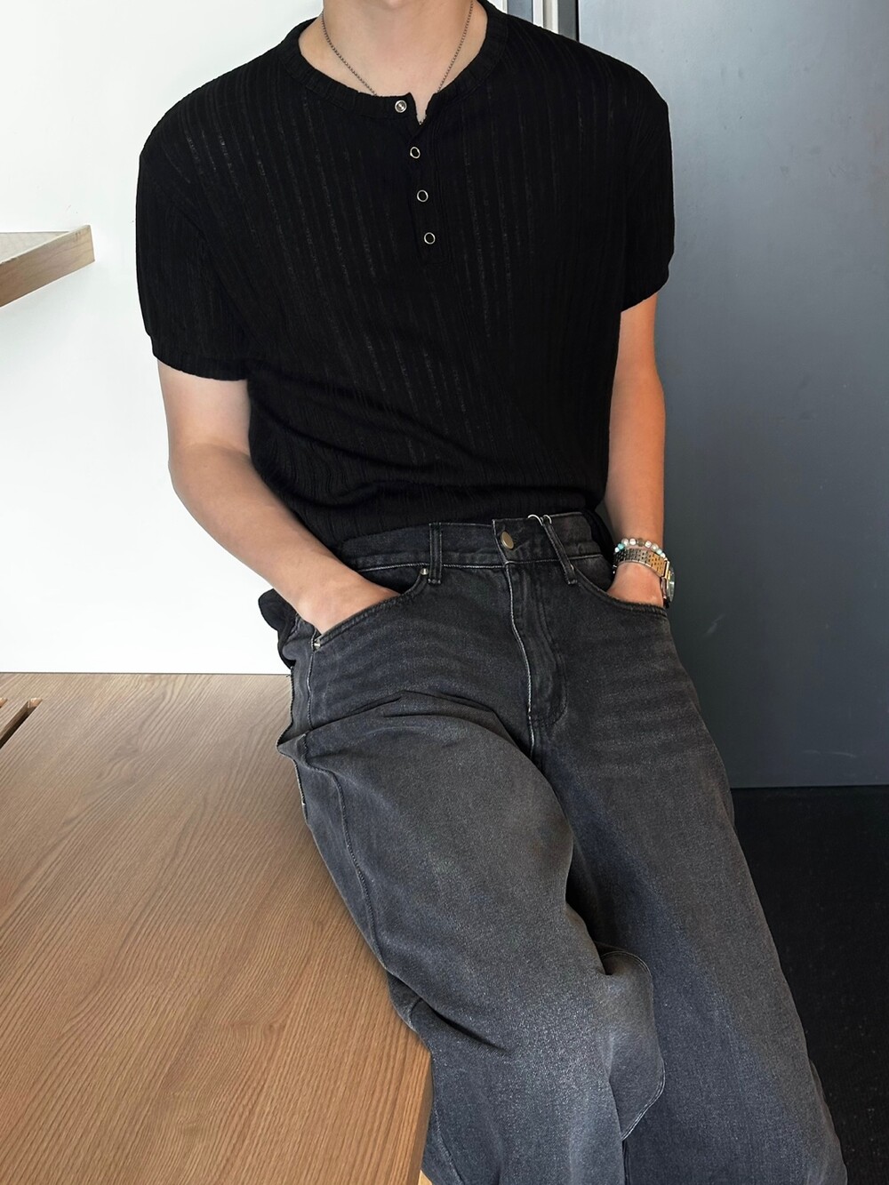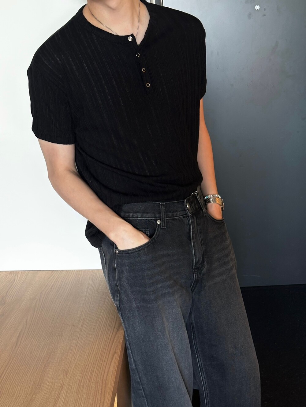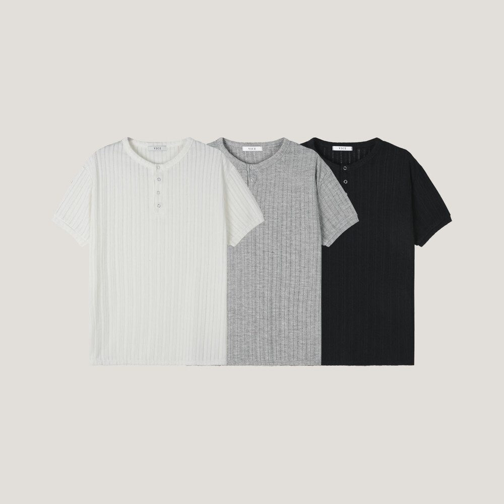 4버튼 실버 헨리넥 디테일에 사이사이 스트라이프 디테일에 바람이 송송 통풍성 좋은 티셔츠입니다 :)