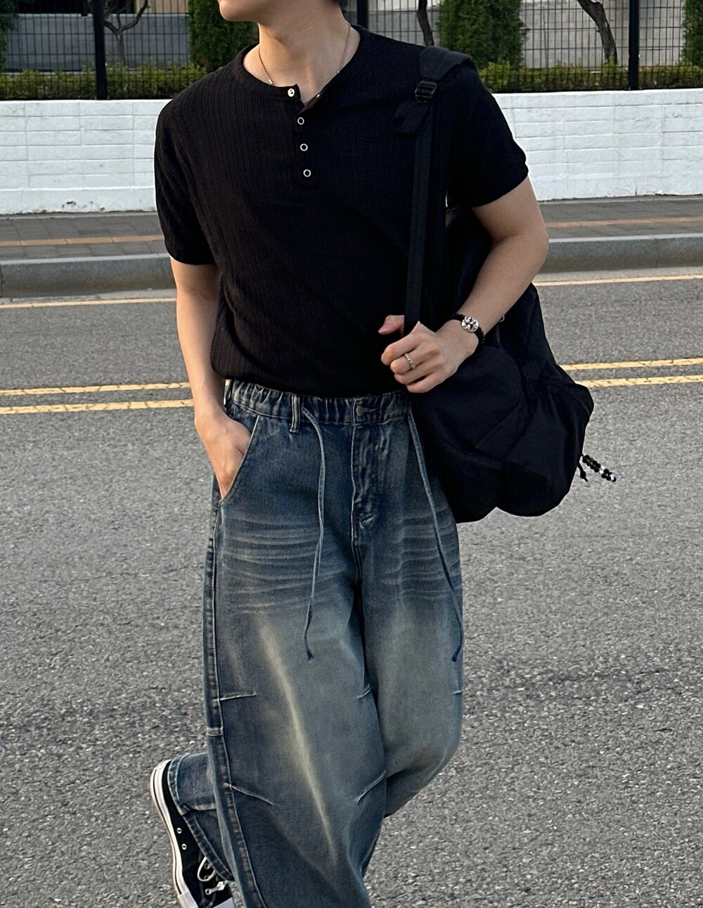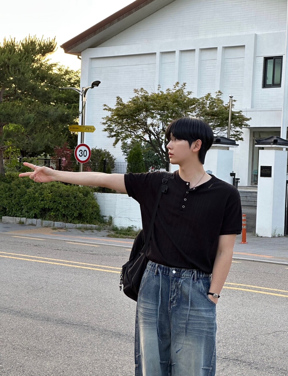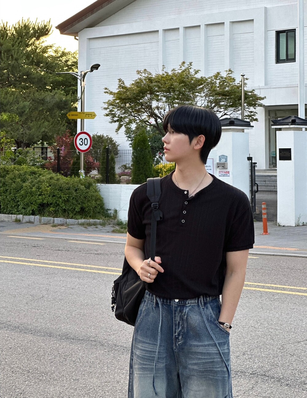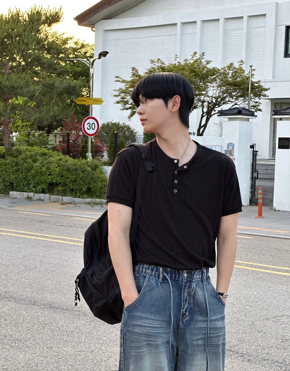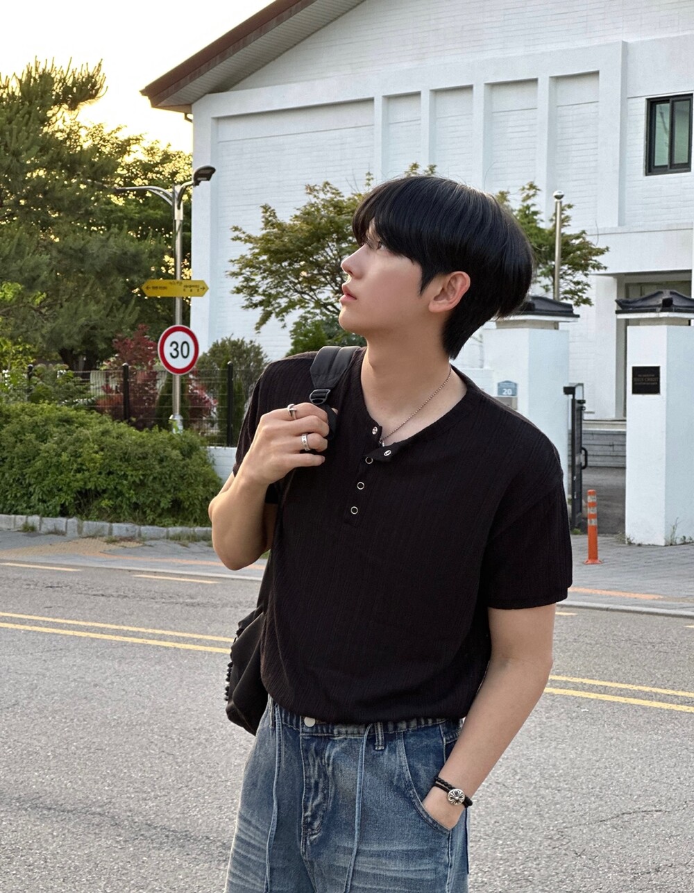 4버튼 실버 헨리넥 디테일에 사이사이 스트라이프 디테일에 바람이 송송 통풍성 좋은 티셔츠입니다 :)