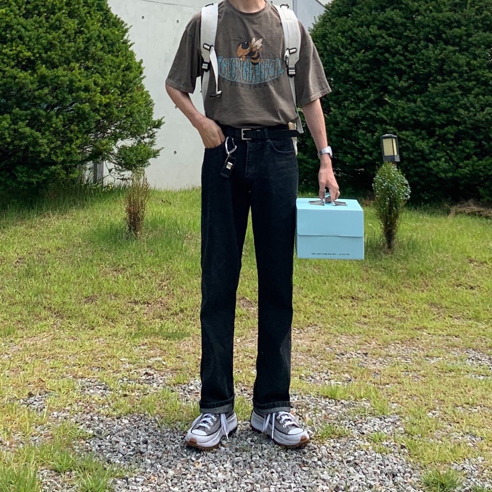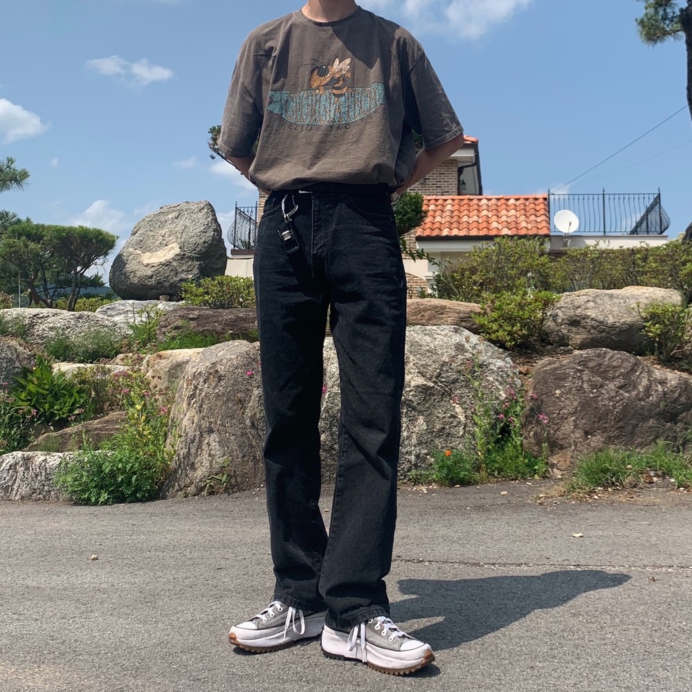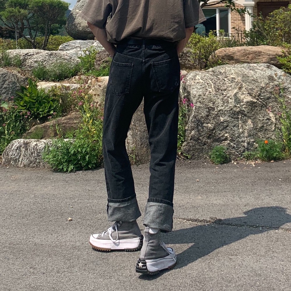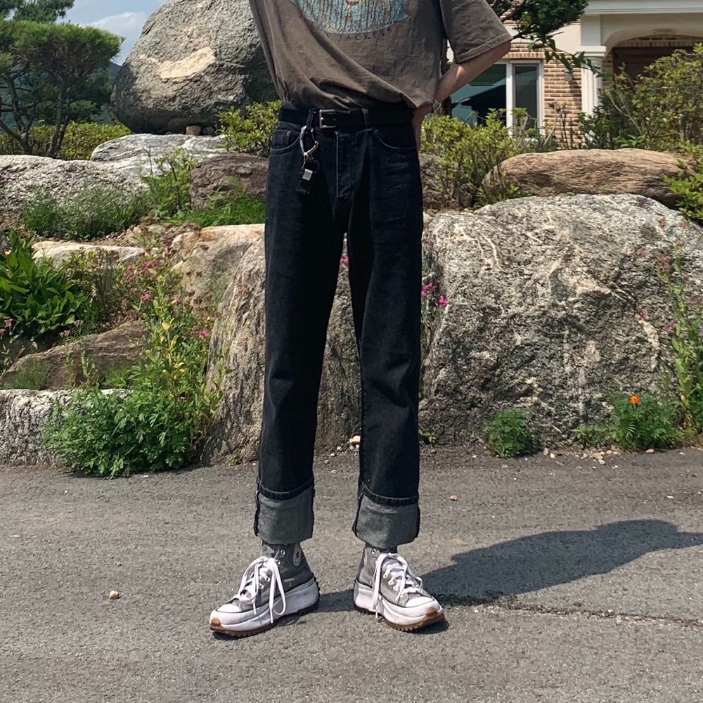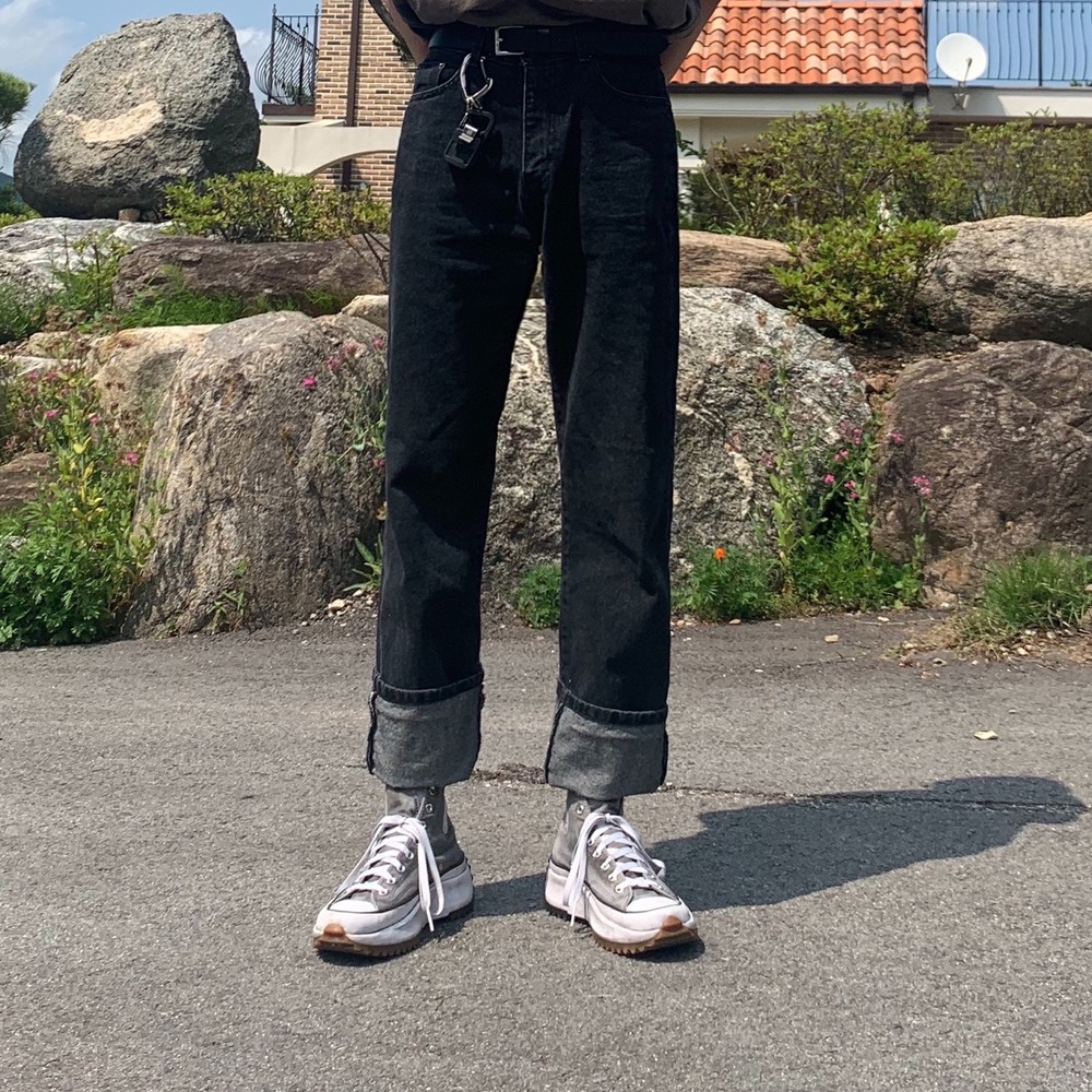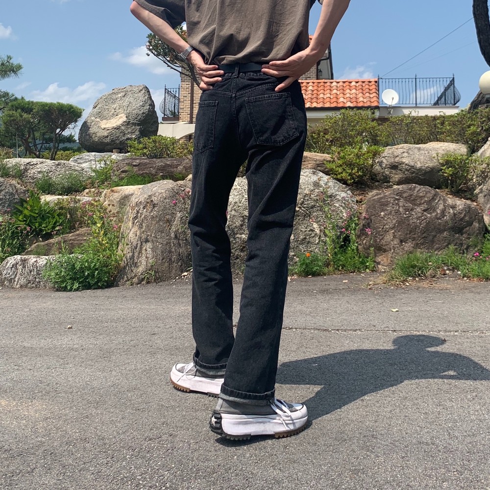 루즈한 핏의 일자로 이쁘게 떨어지는 오리지널한 흑청 팬츠입니다