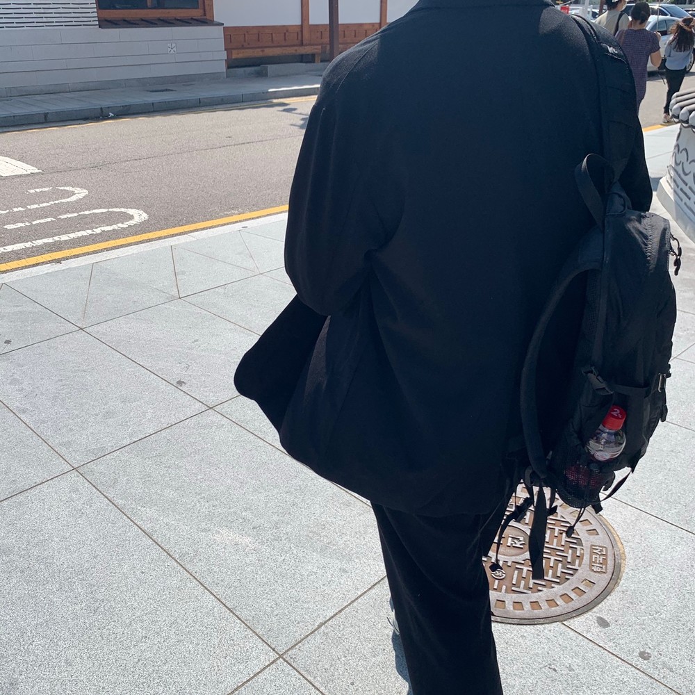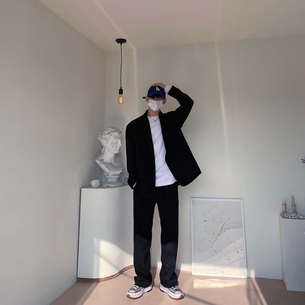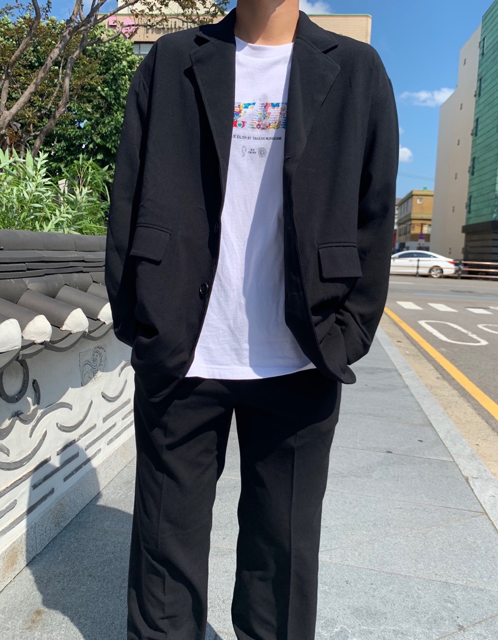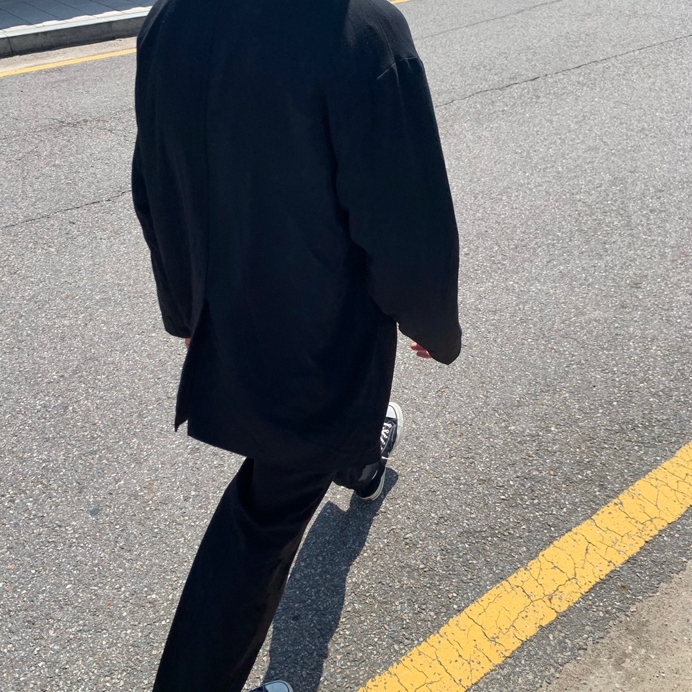 검정색상의 루즈한 대디핏 느낌이라 누구나 소화하기 쉬운 셋업이고 자켓이나 팬츠 따로 다른 아이템과 매치해도