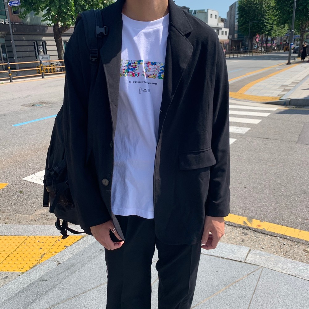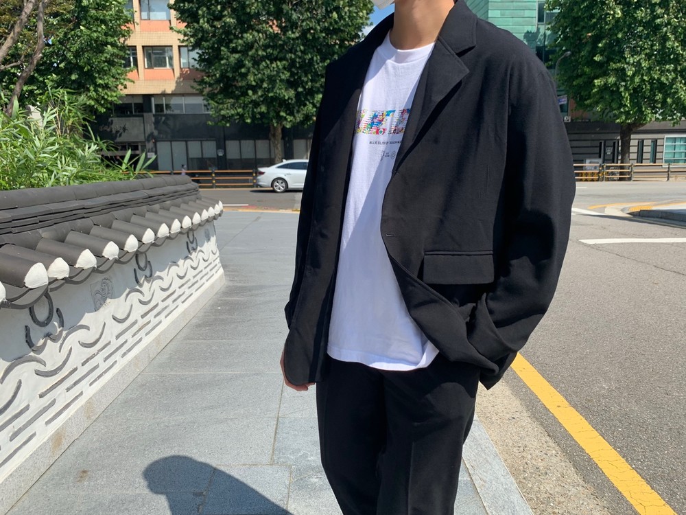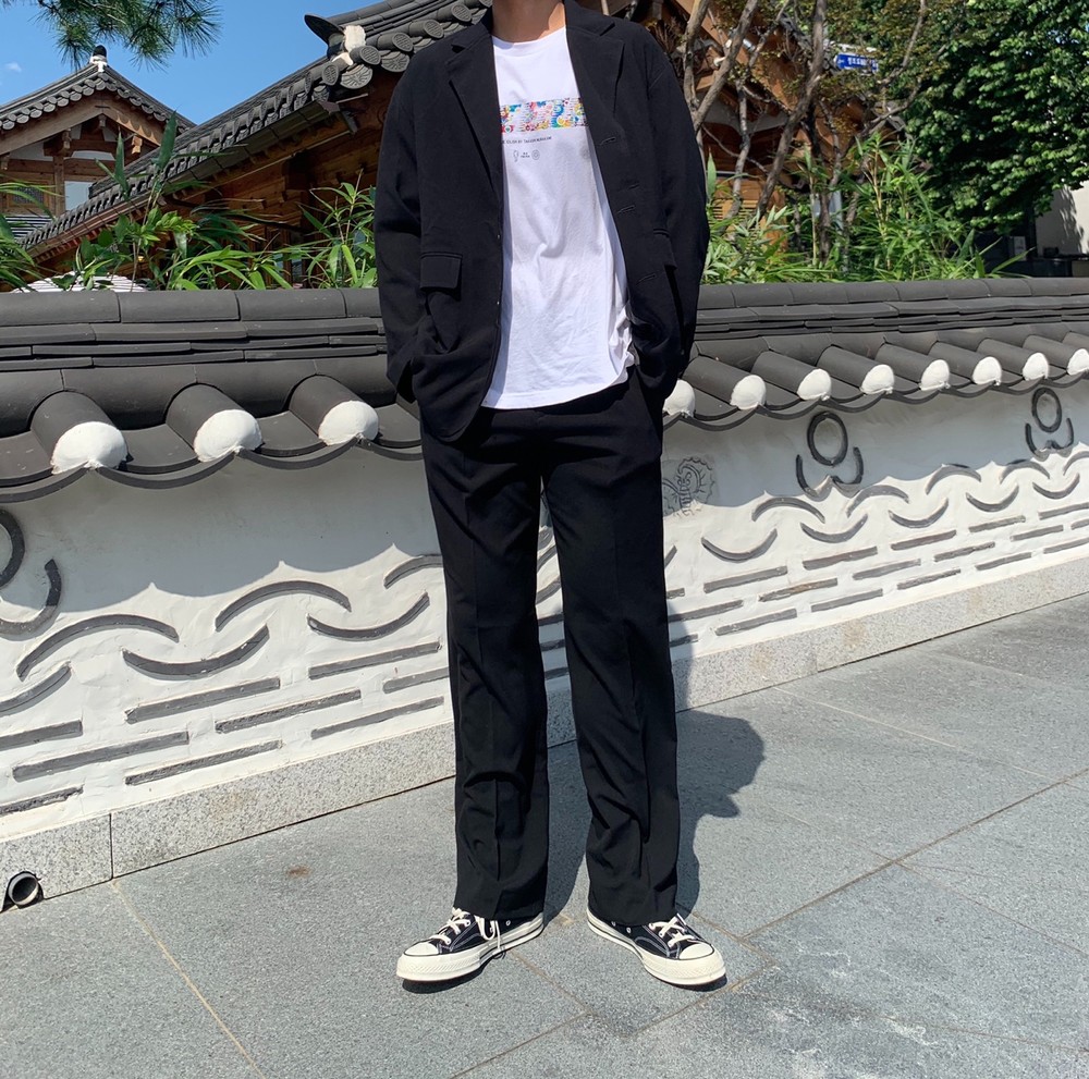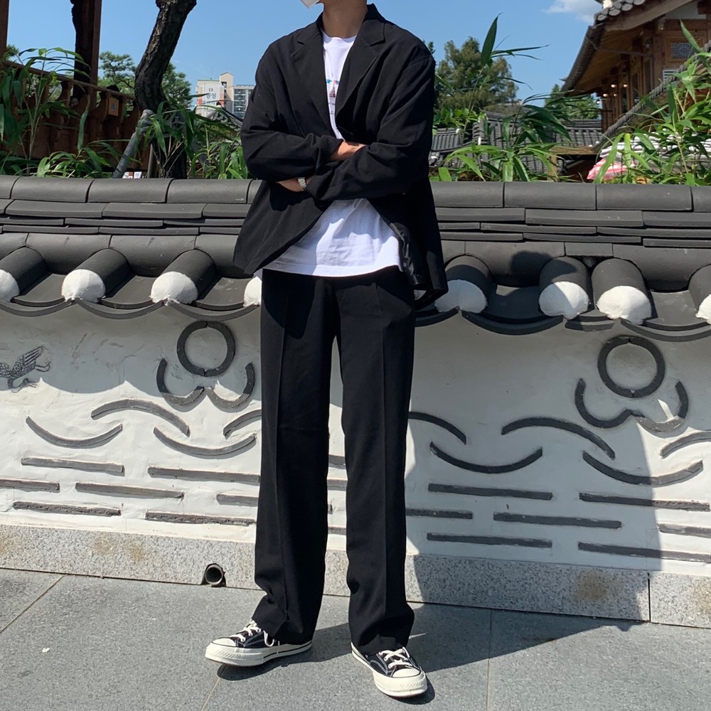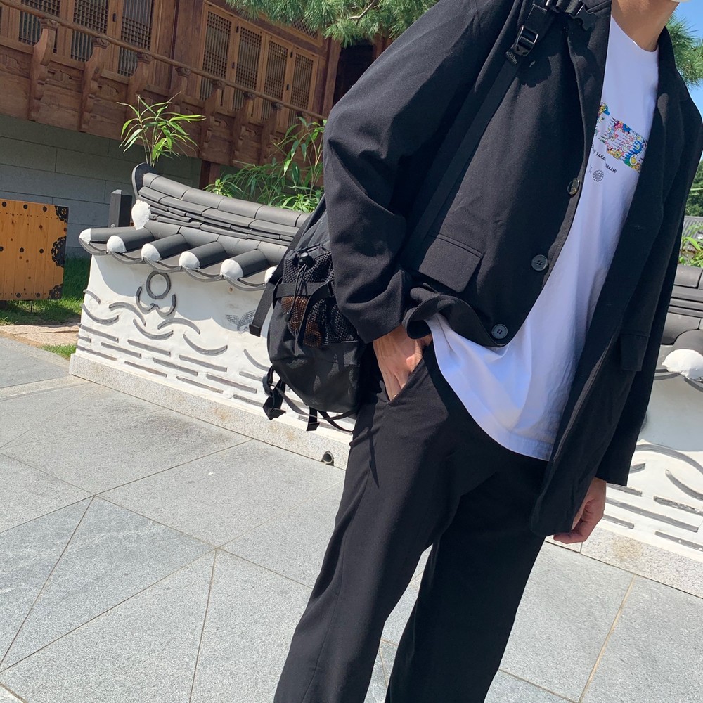 검정색상의 루즈한 대디핏 느낌이라 누구나 소화하기 쉬운 셋업이고 자켓이나 팬츠 따로 다른 아이템과 매치해도